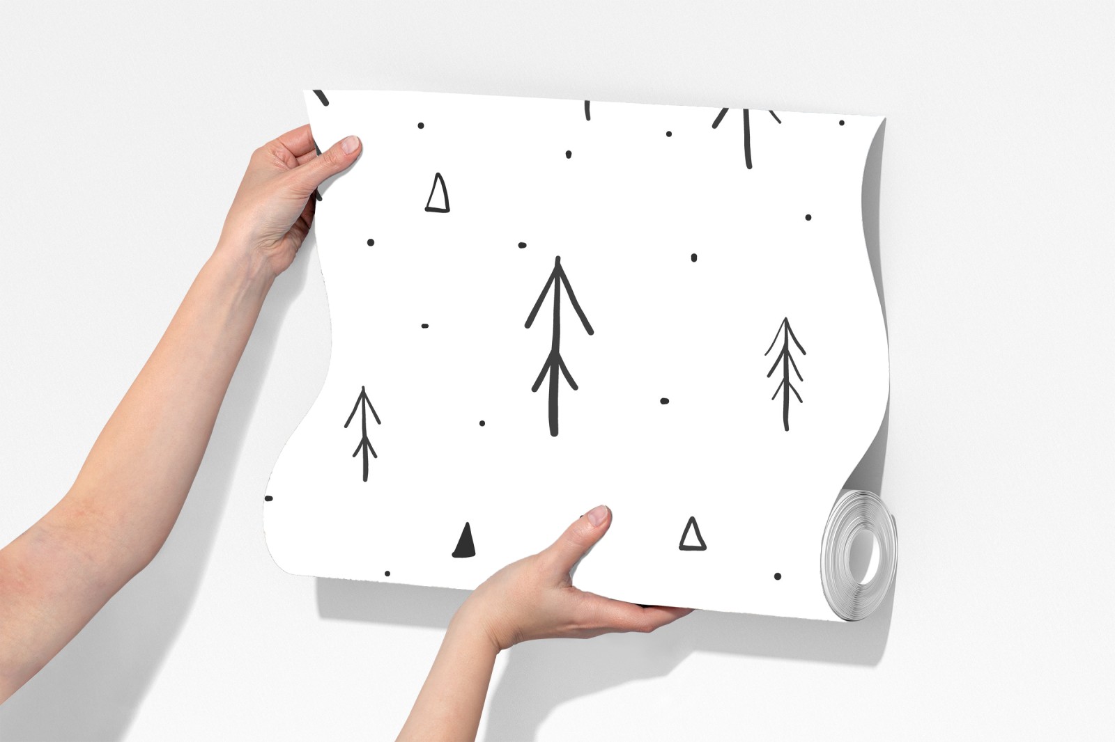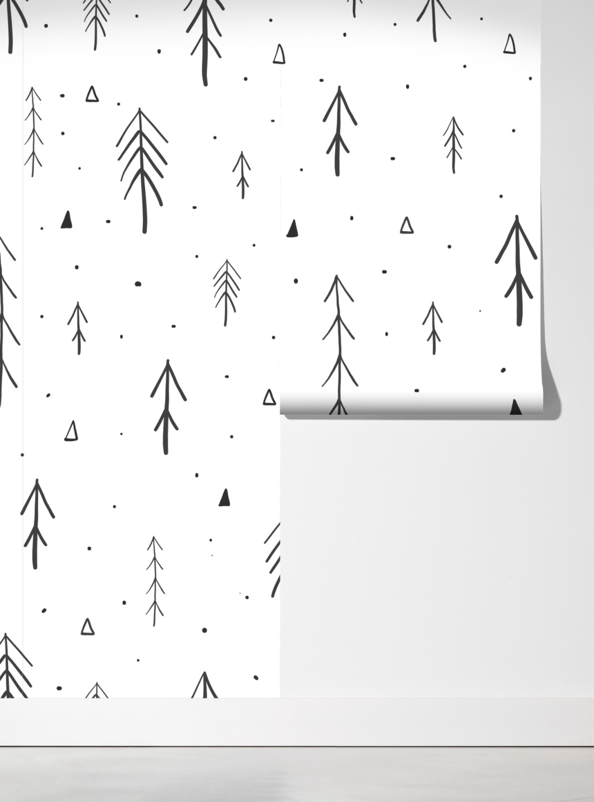 Ein beruhigendes schwarz-weiß Baum-Muster im minimalistischen Stil verleiht skandinavischen Charme für Kinderzimmer und moderne Wohnräume.