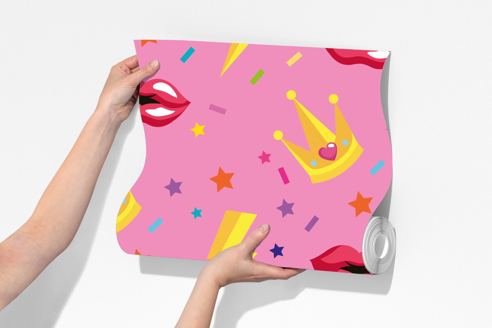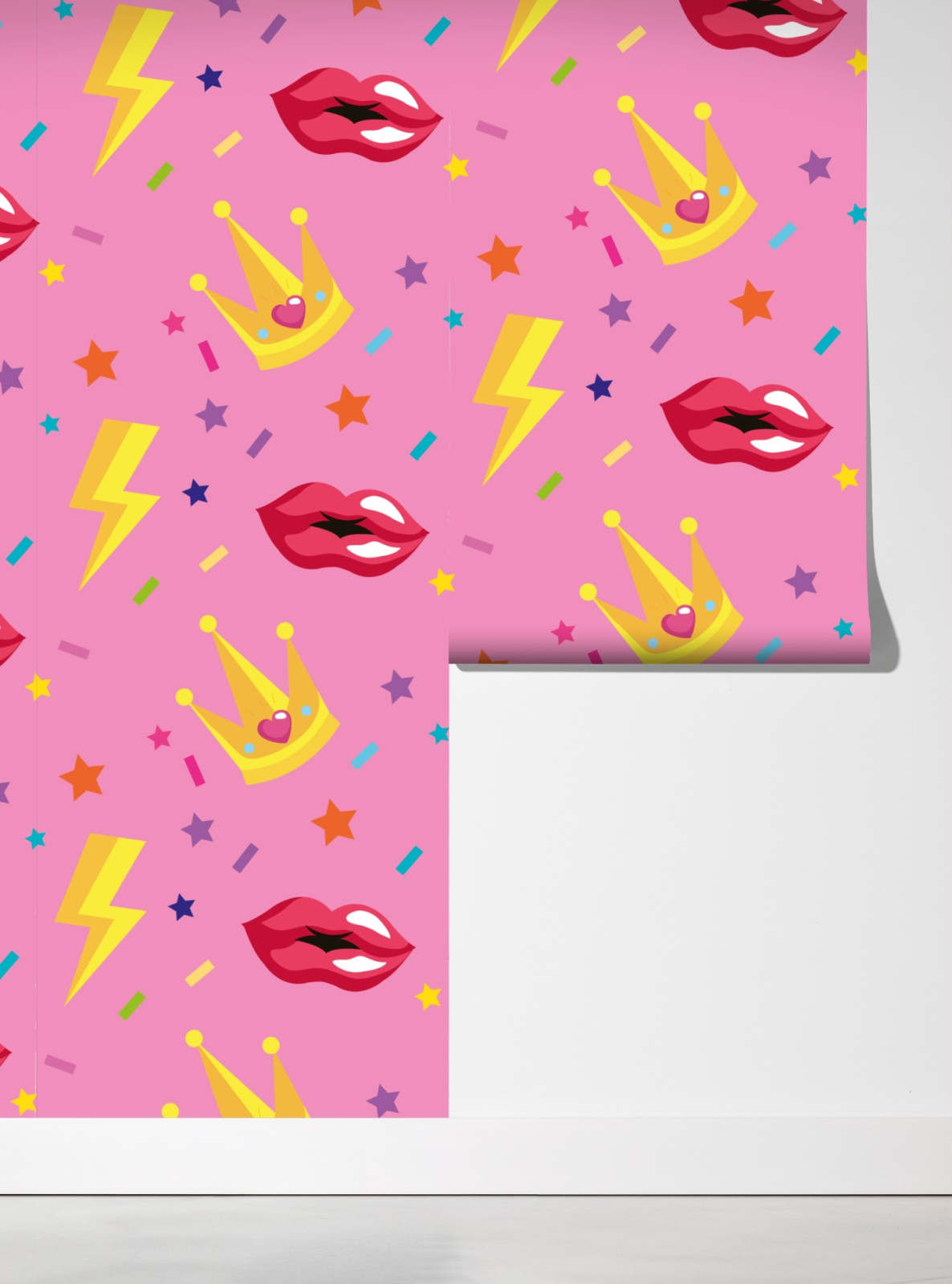 Lebendiges und verspieltes Muster mit Kronen, Lippen und Blitzsymbolen, ideal für Kinderzimmer und bunte Innenräume.