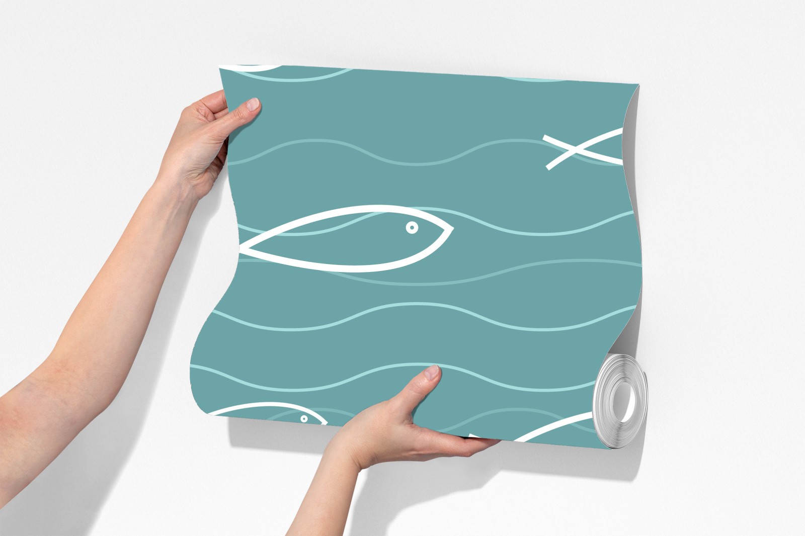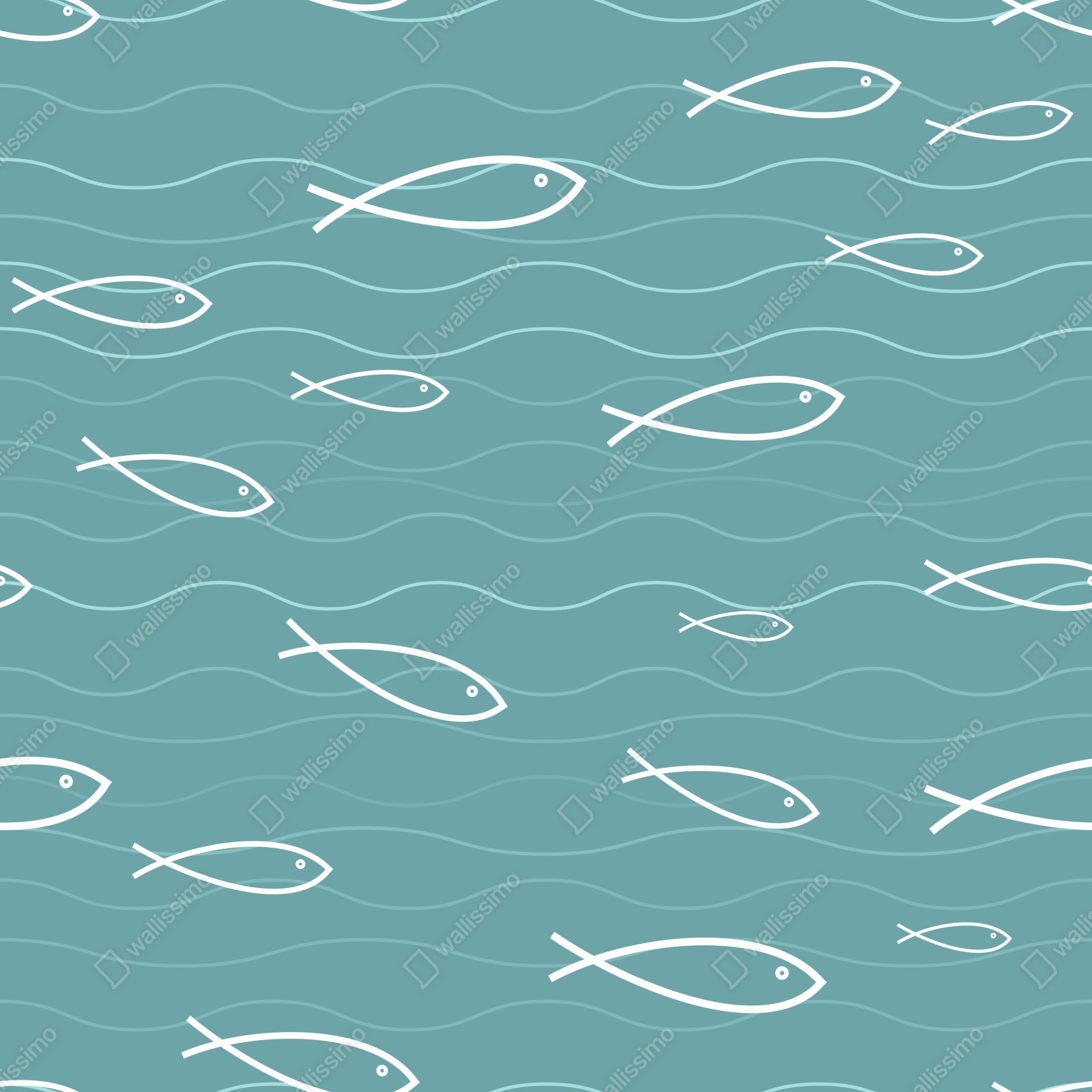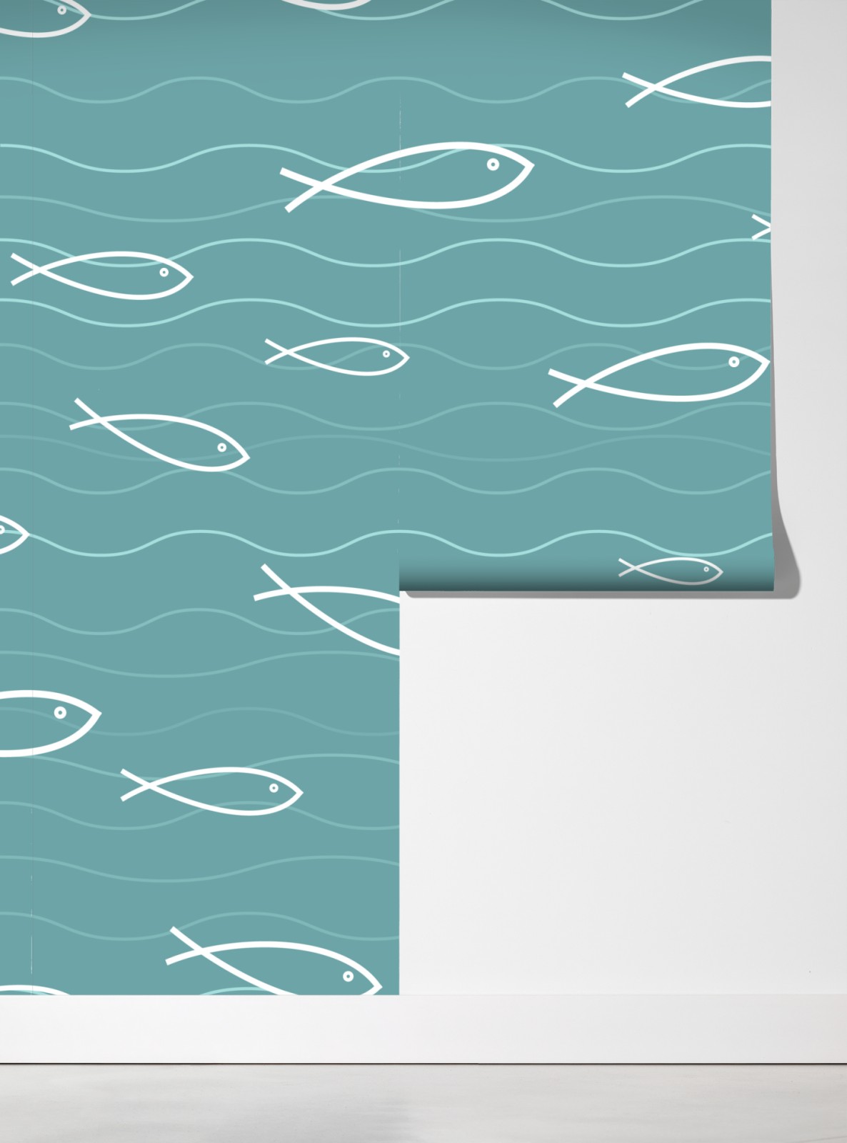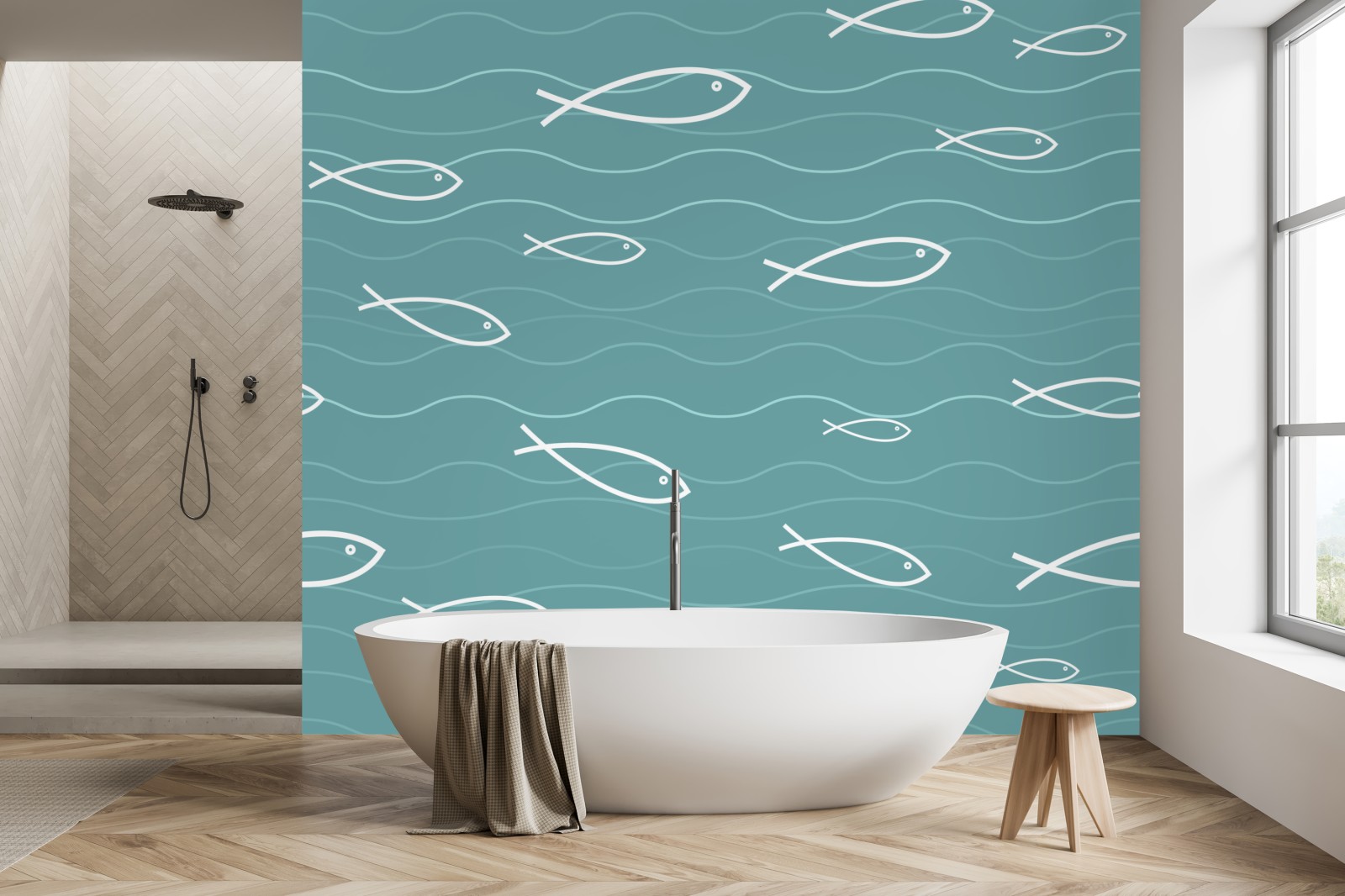 Beruhigendes, maritimes Fischmuster in sanften türkistönen, ideal für Badezimmer oder Kinderzimmer; verleiht jeder Wand einen minimalistischen, ozeanischen Touch.