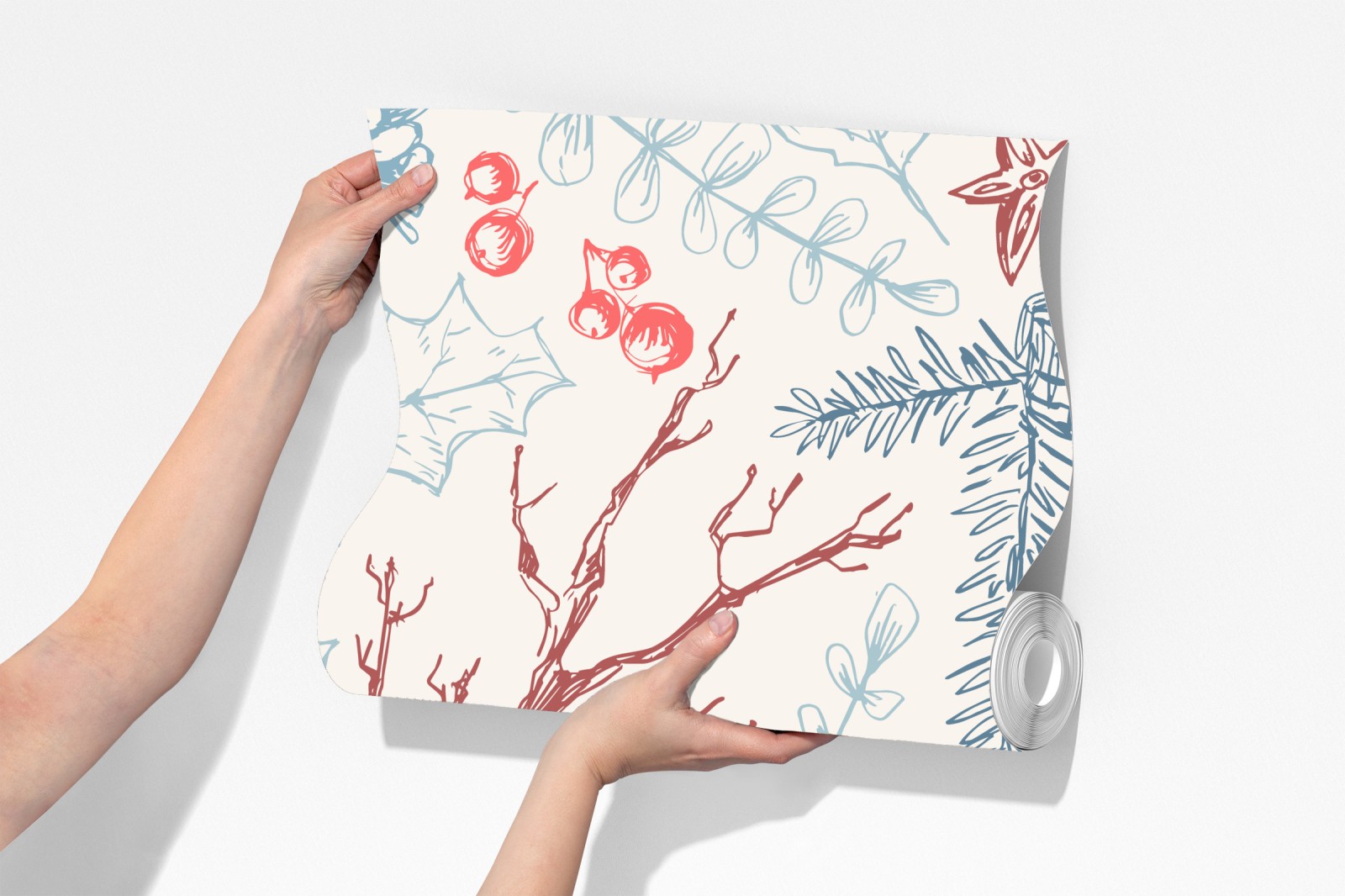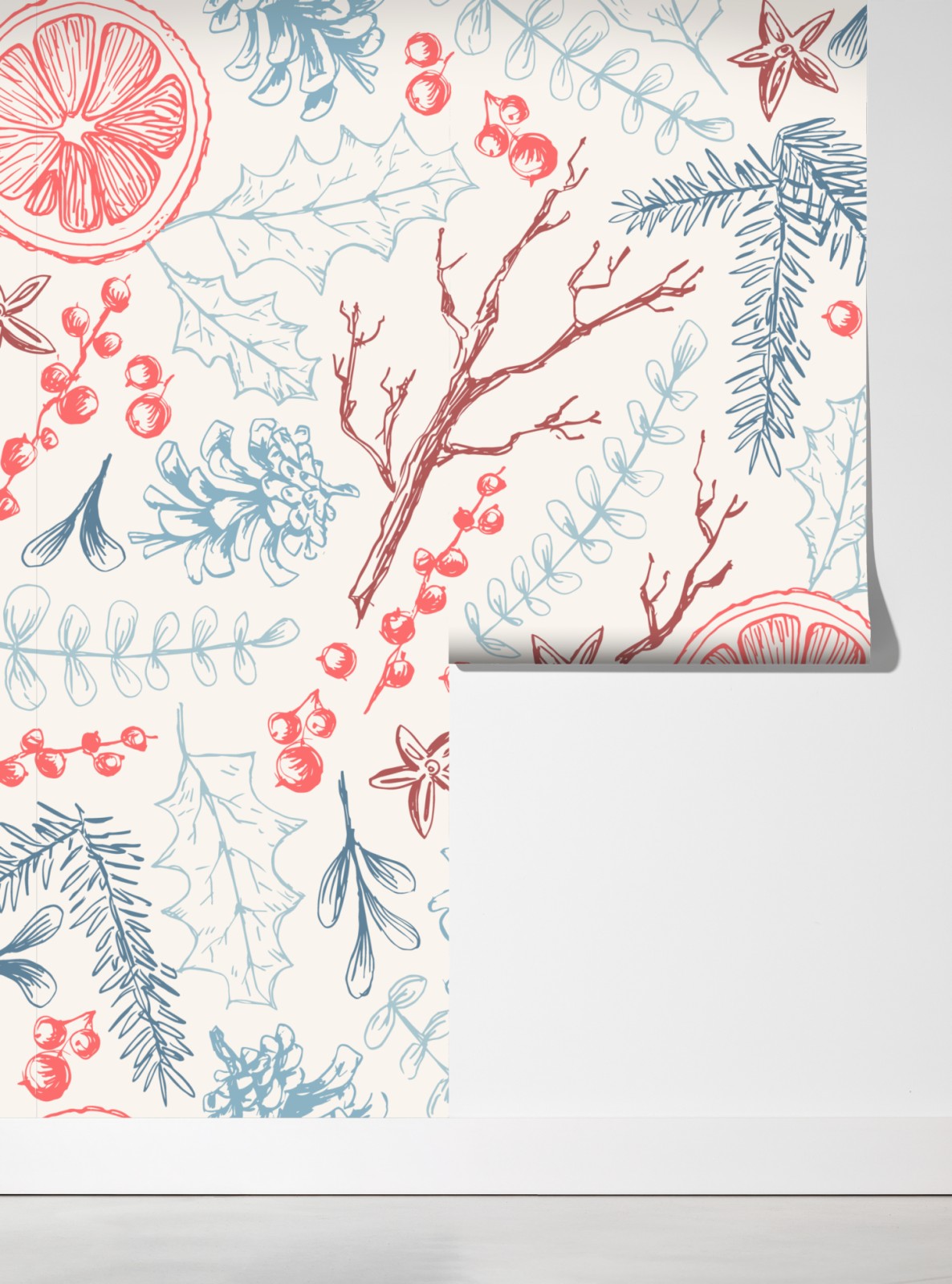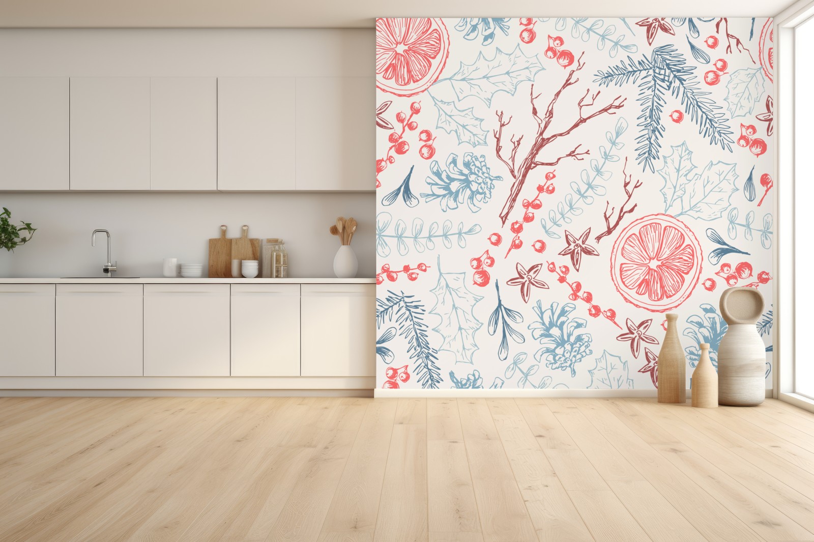zartes handgezeichnetes botanisches muster mit zitrusscheiben, tannenzapfen und beeren in sanften pastelltönen, ideal für gemütliche saisonale dekoration.