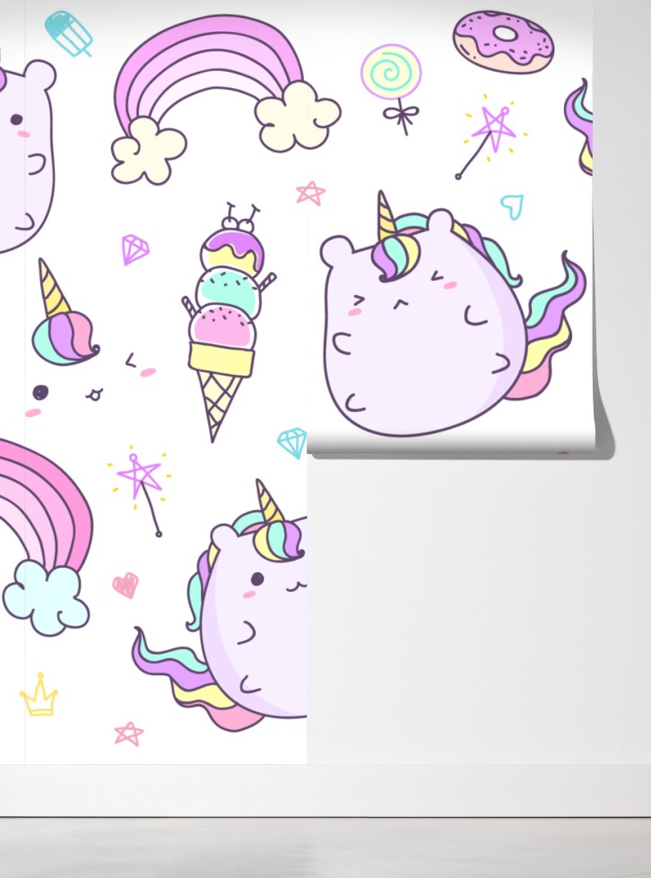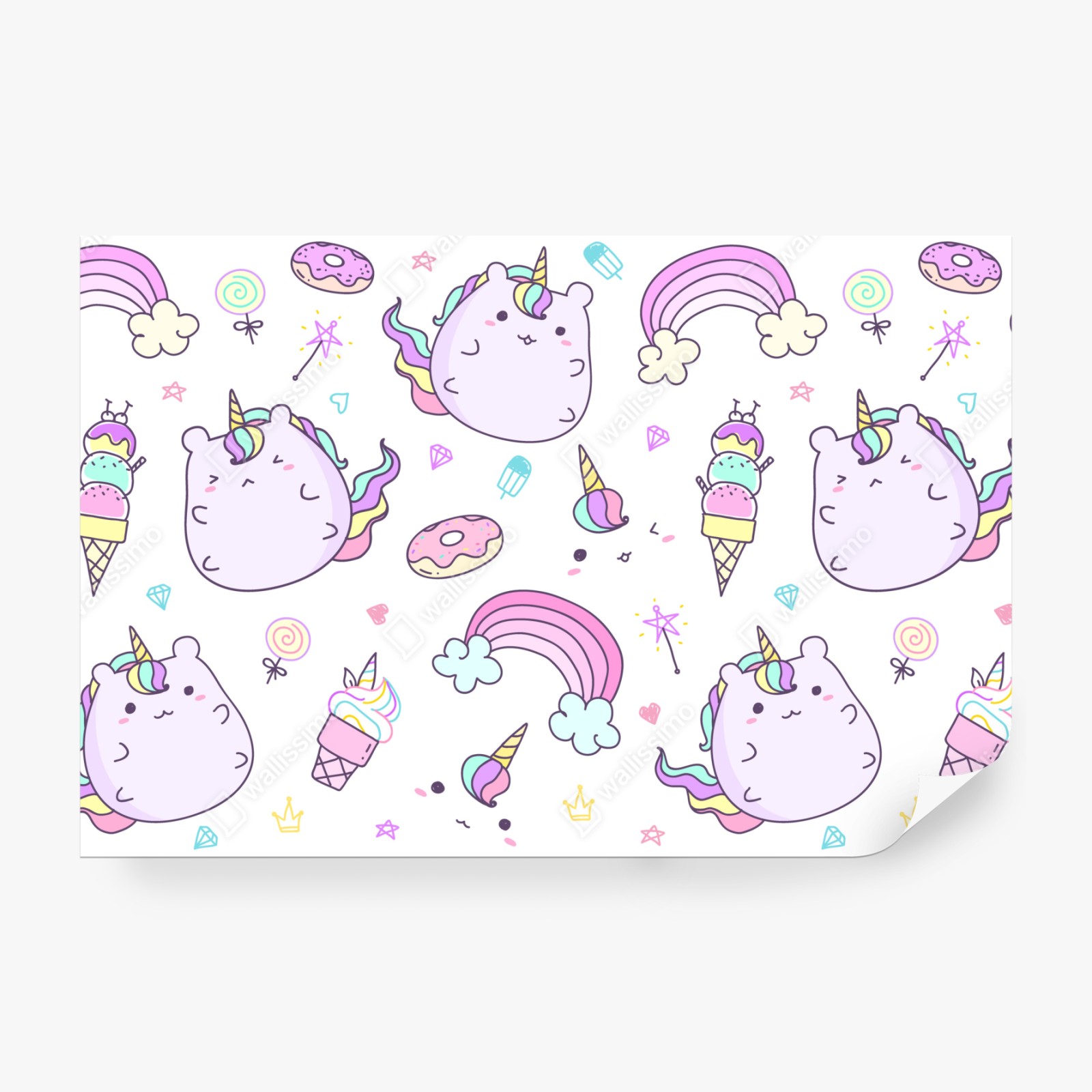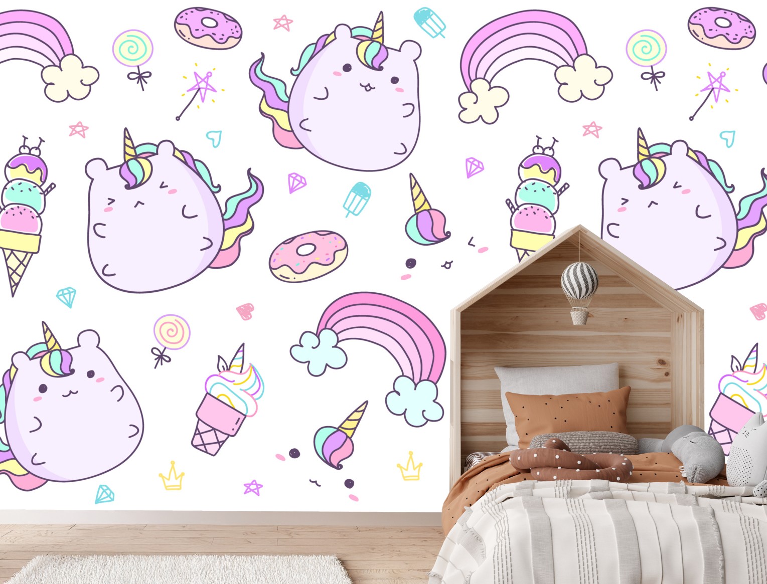 niedliches pastell-einhorn-katzenmuster bringt verspielten charme mit regenbögen und süßigkeiten ins kinderzimmer.