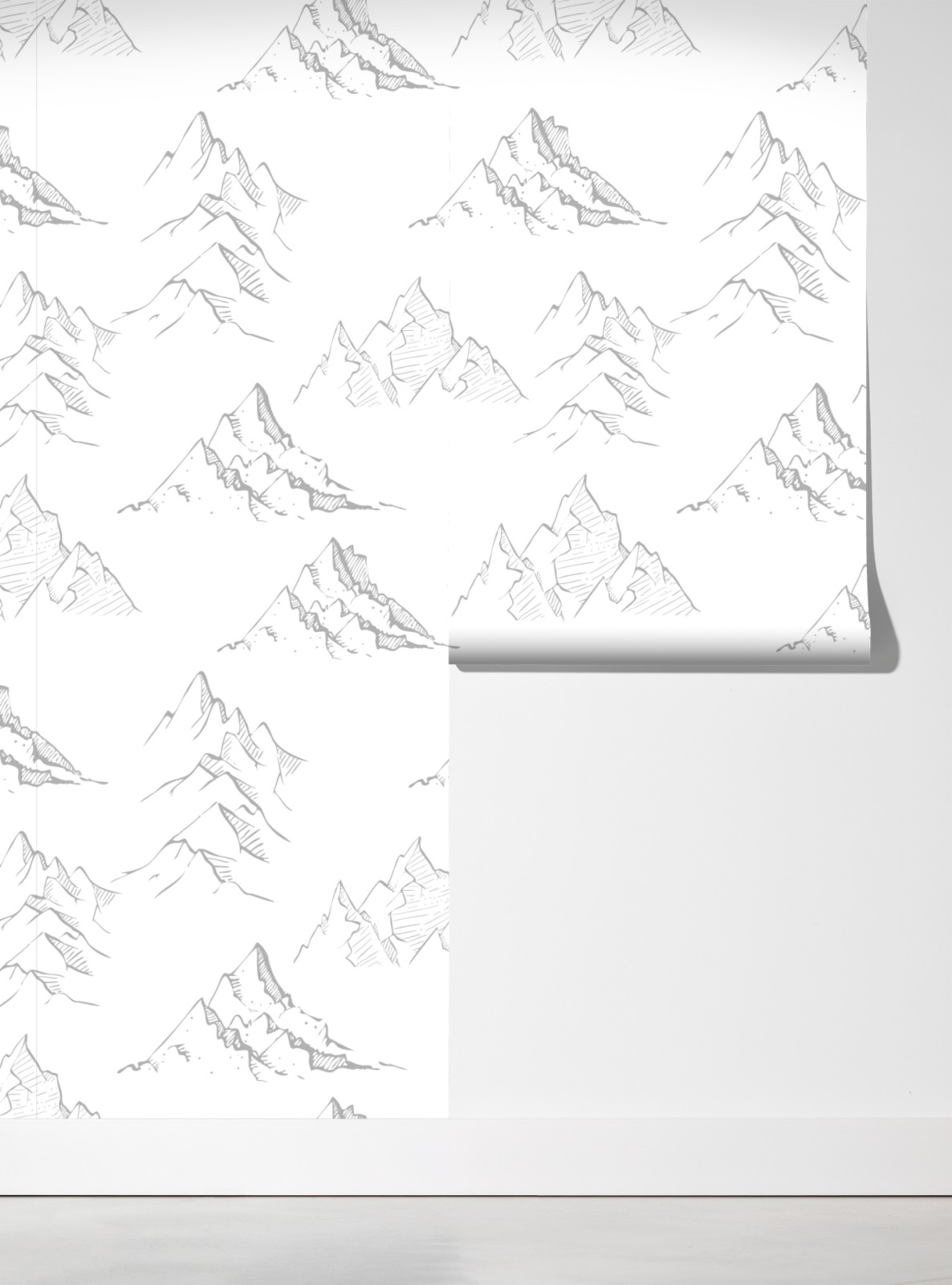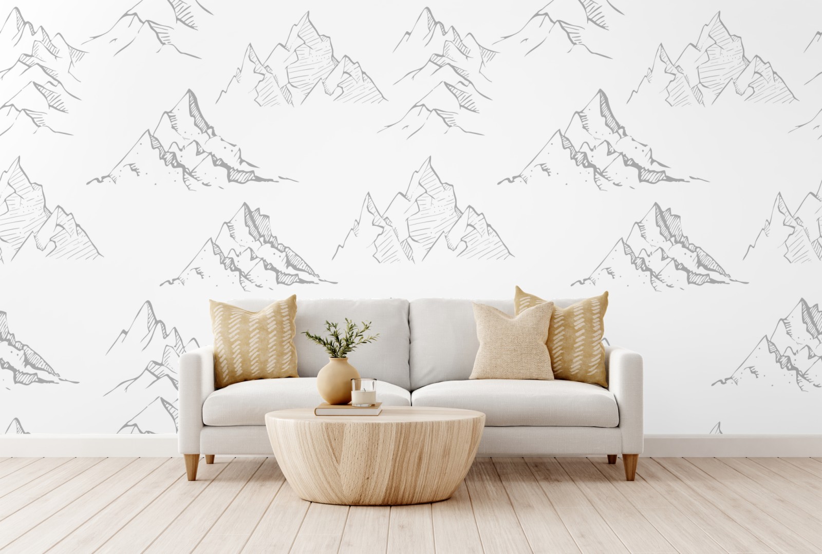 zarte handgezeichnete bergskizzen in einem nahtlosen monochromen muster verleihen jedem raum eine ruhige, minimalistische atmosphäre.
