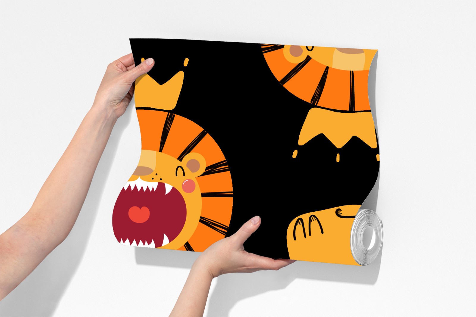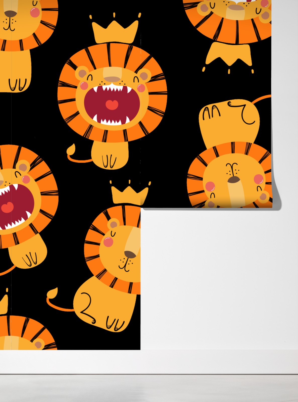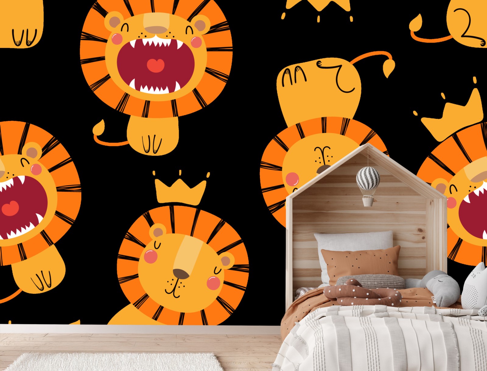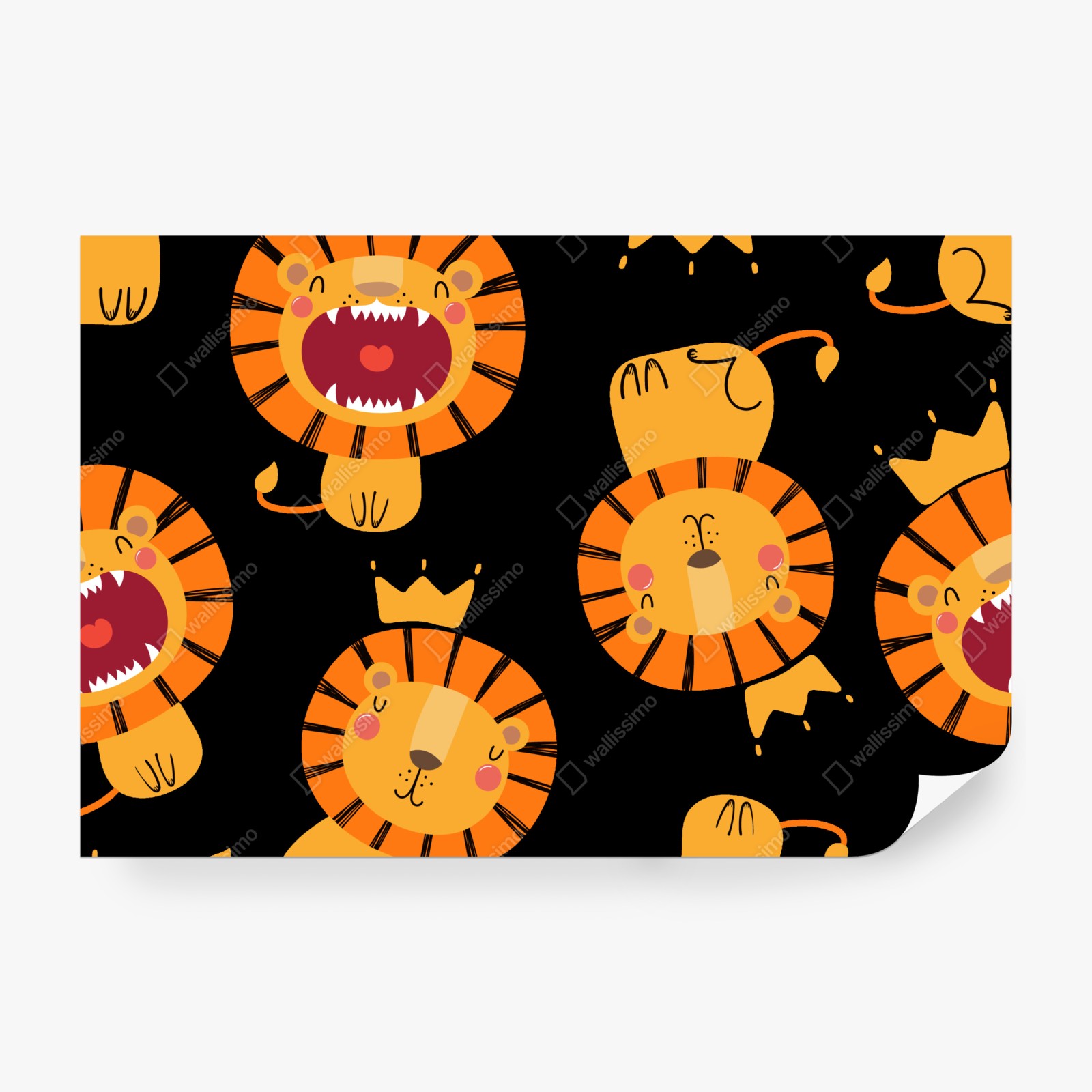 Bunte und verspielte Löwenillustration mit Kronen auf schwarzem Hintergrund, ideal um Kinderzimmer oder Krippen fröhlich zu gestalten.