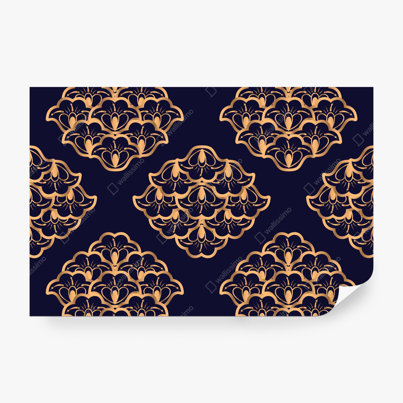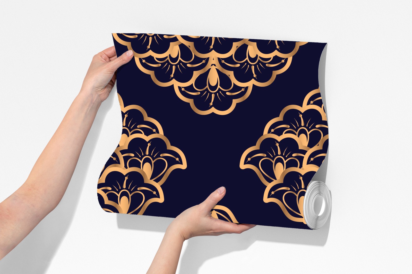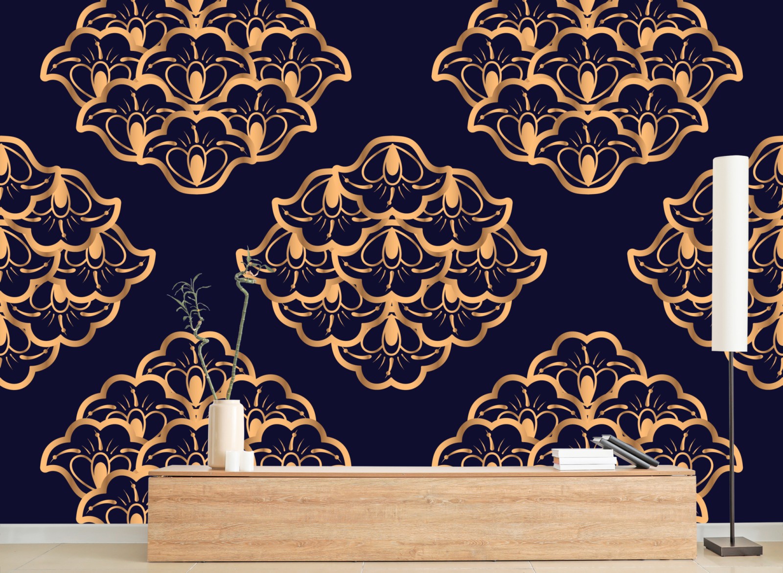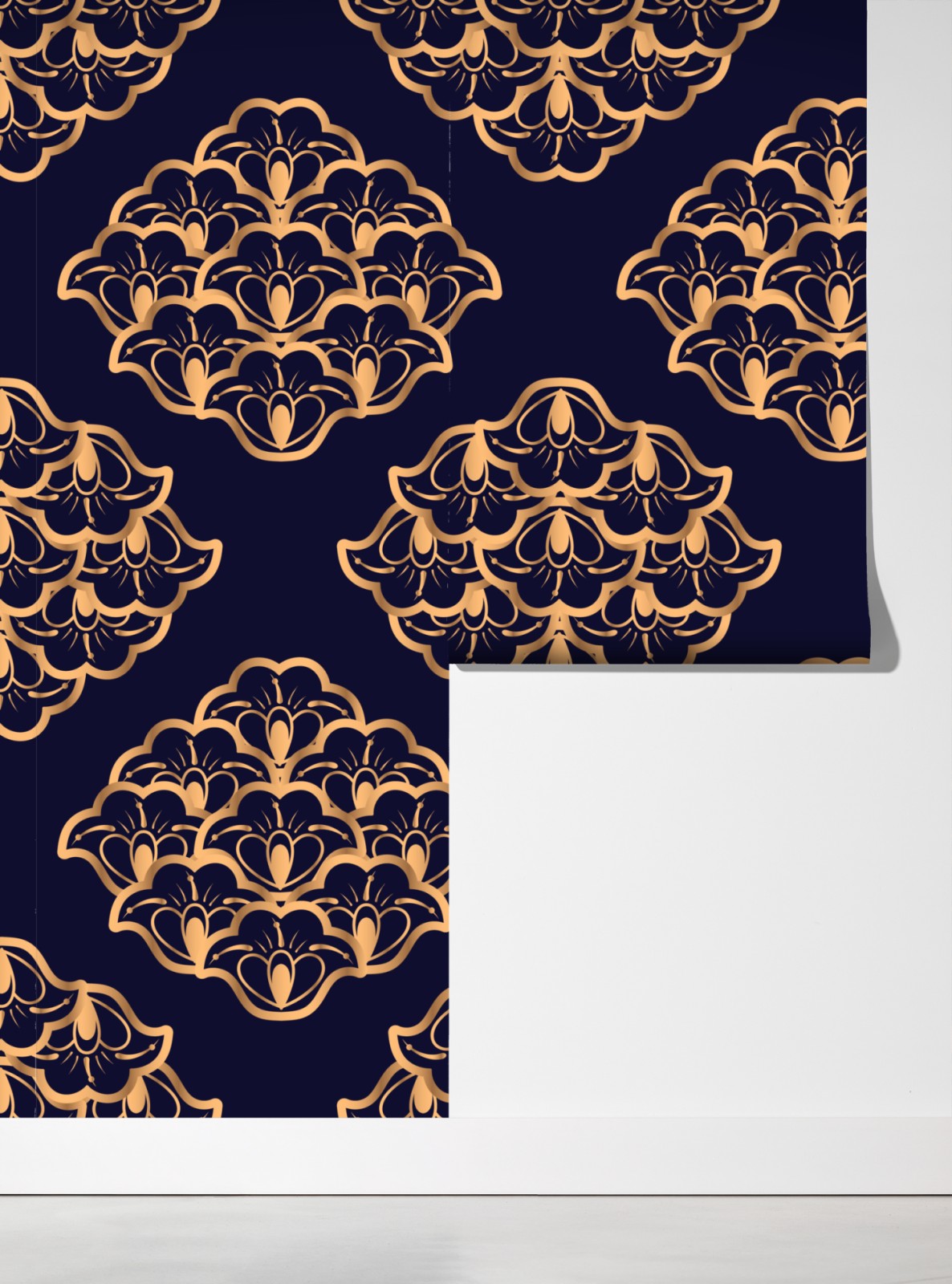 Elegantes goldenes Damastmuster auf tiefem Marineblau verleiht jedem Raum luxuriösen und zeitlosen Charakter.