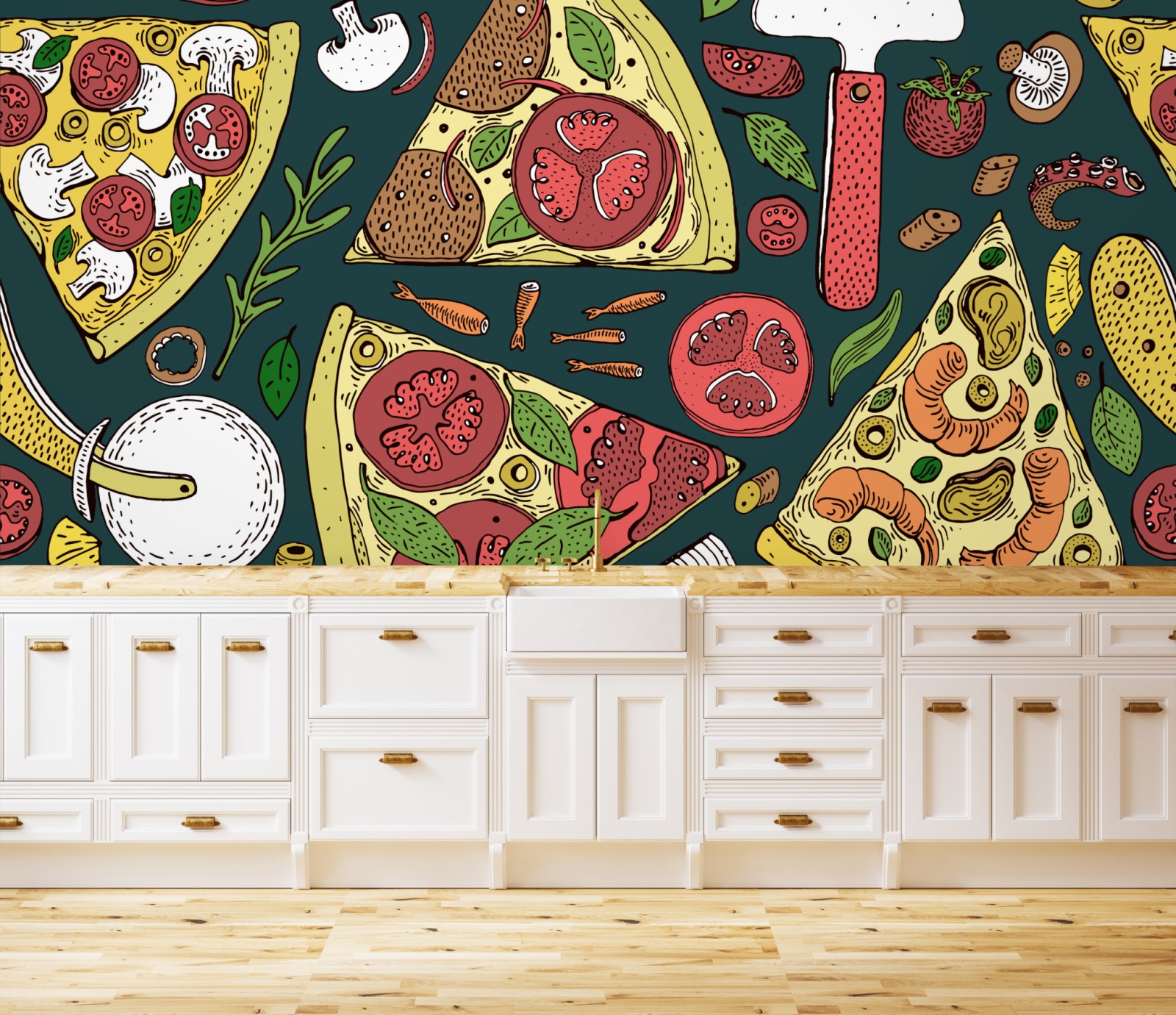 Lebhaftes und verspieltes Pizzamuster verleiht Küche und Essbereich eine kulinarische Atmosphäre.
