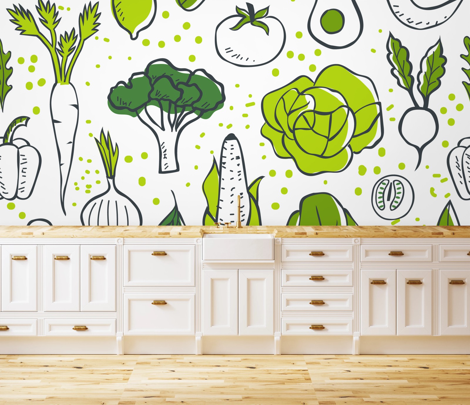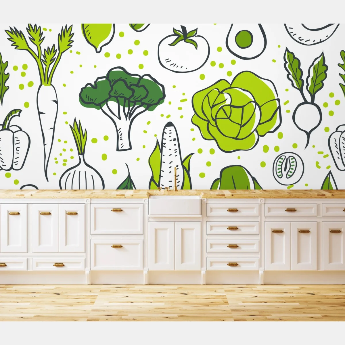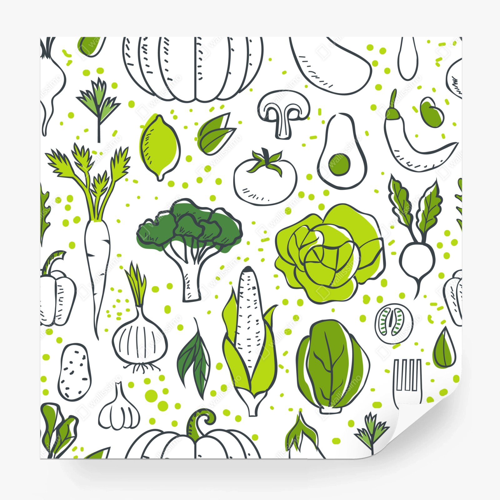 verspieltes handgezeichnetes gemüsemuster in frischen grüntönen verleiht ihrer küche oder dem essbereich einen modernen, gesunden akzent.MehrWeniger