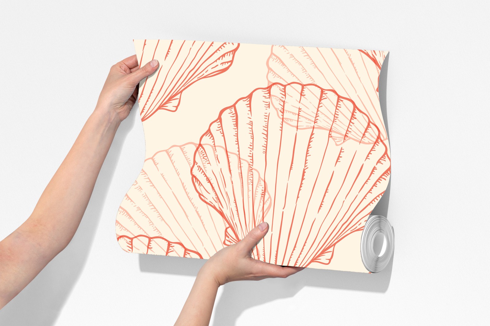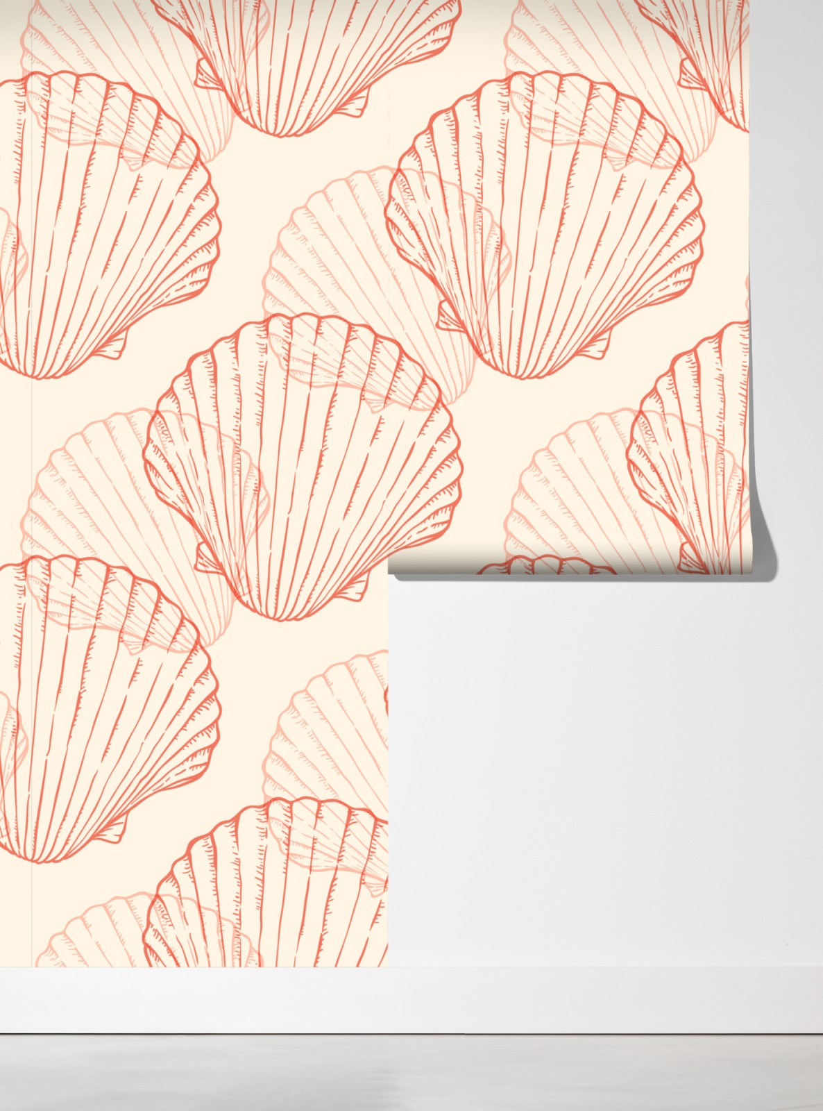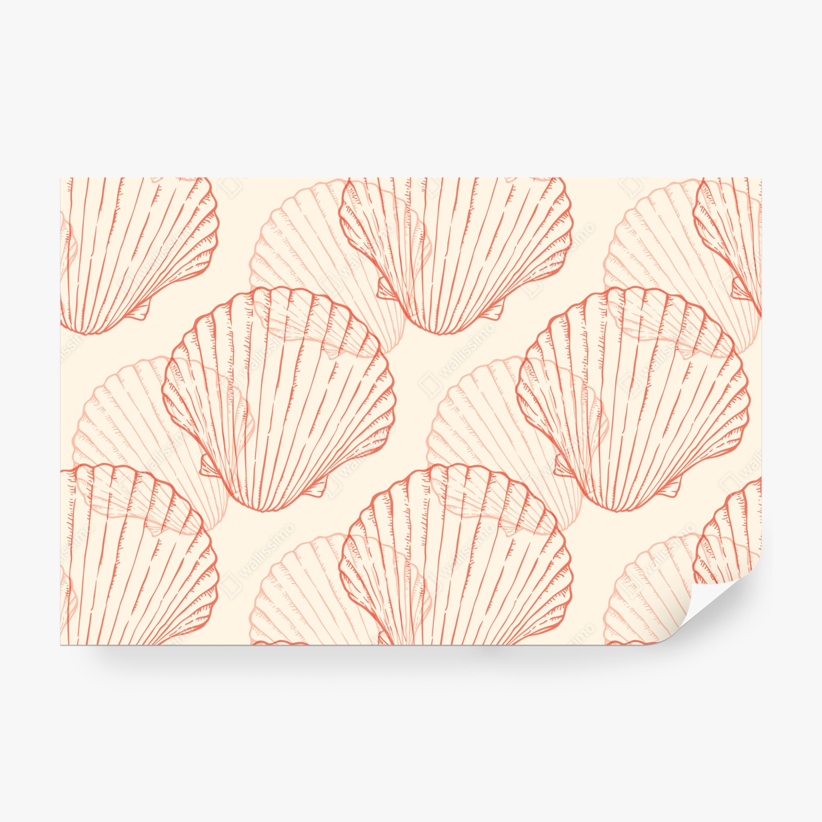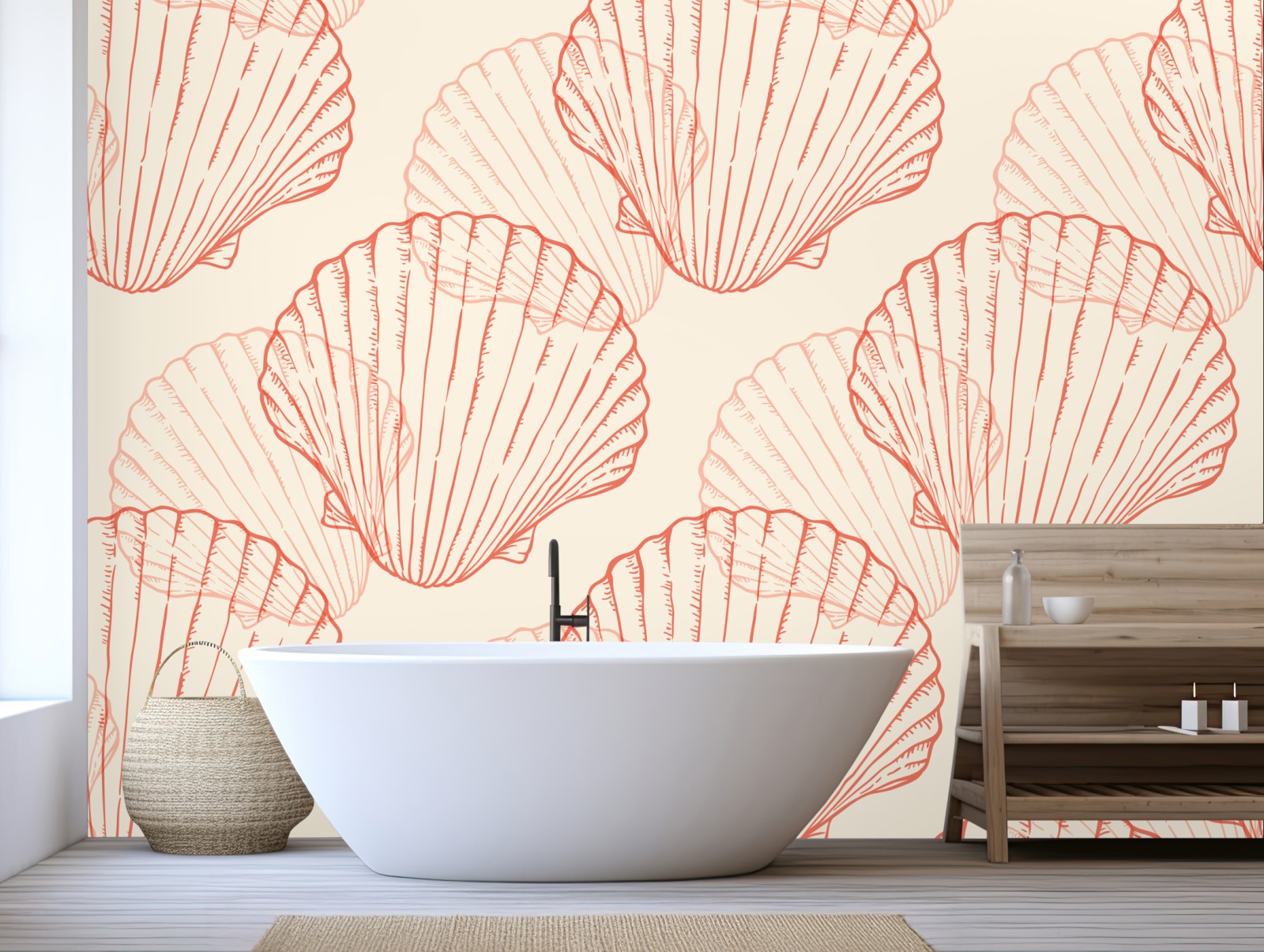 Zarte korallenfarbene Jakobsmuscheln auf warmem beigen Hintergrund schaffen ein beruhigendes maritimes Muster ideal für Badezimmer oder Stranddekor.