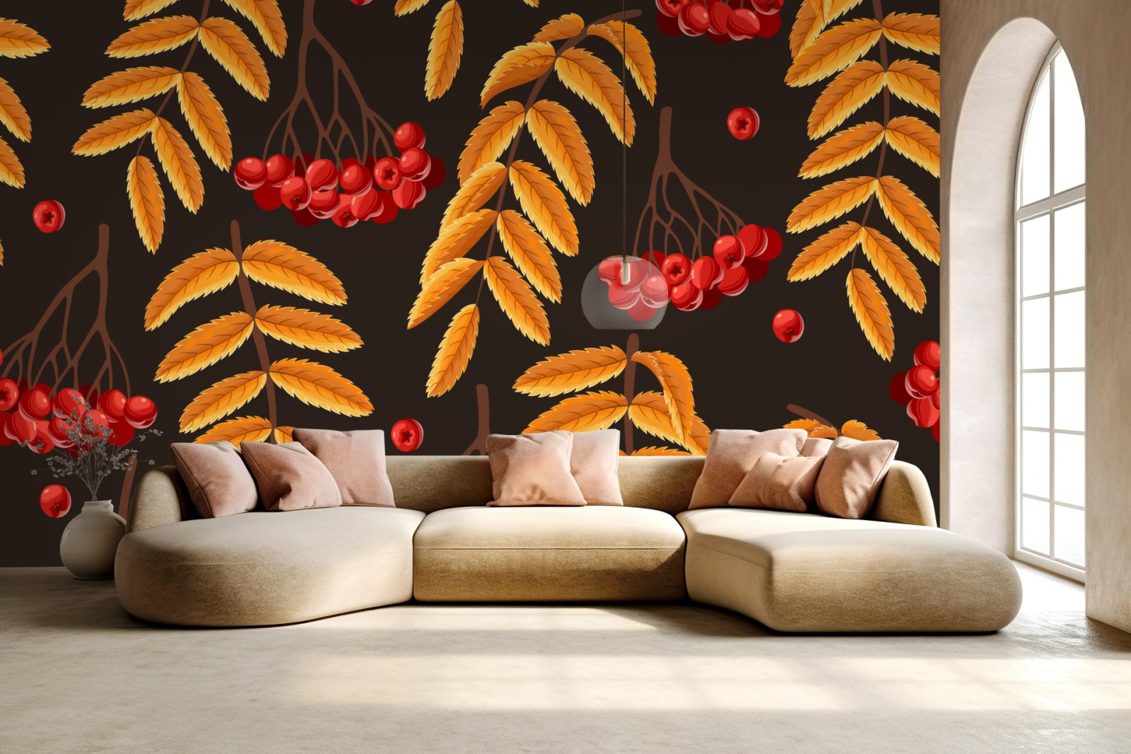 Fototapete Herbstliches muster mit vogelbeeren und blättern
