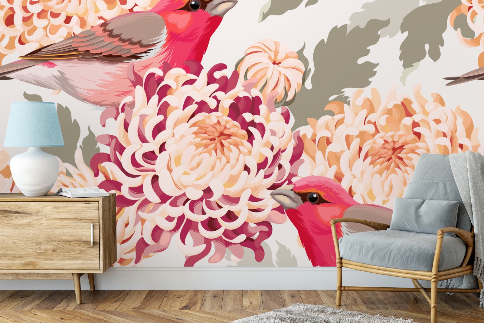 zarte illustration rosa vögel zwischen chryzanthemen, die jedem raum einen subtilen botanischen akzent verleiht.MehrWeniger