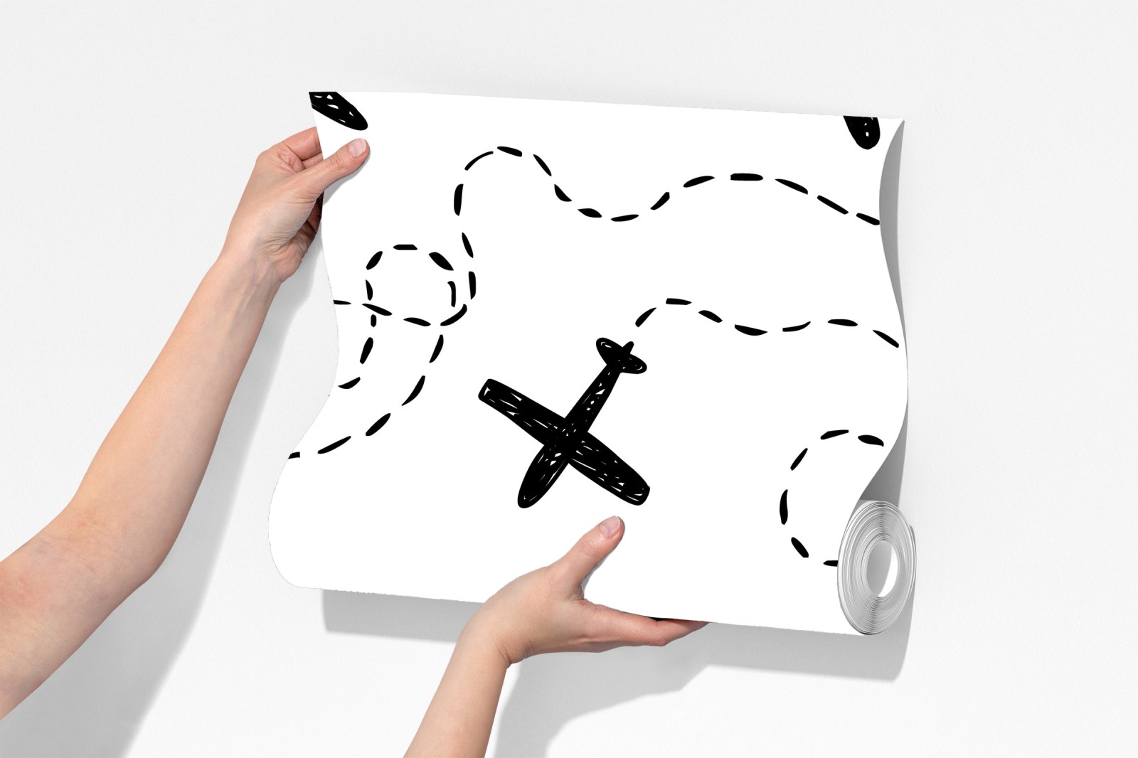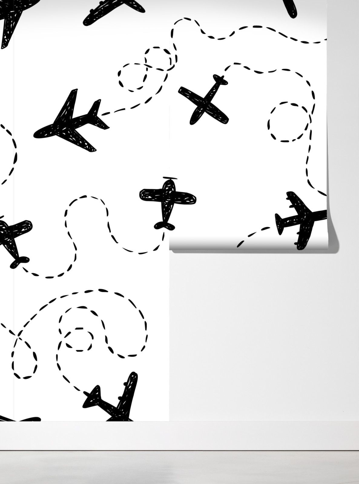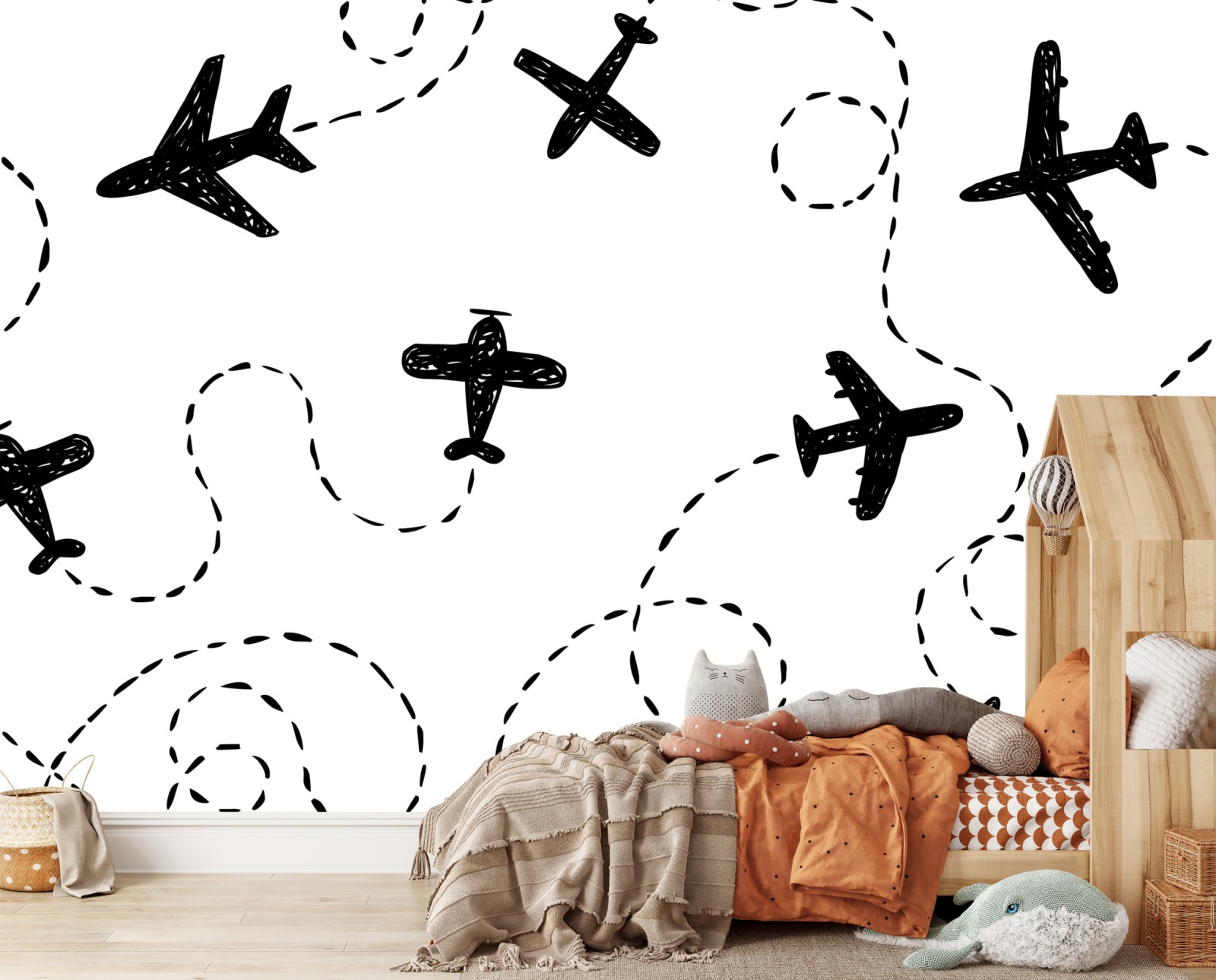 verspieltes, handgezeichnetes flugzeugmuster in schwarzweiß verleiht kinderzimmern und babyzimmern eine moderne, minimalistische note.