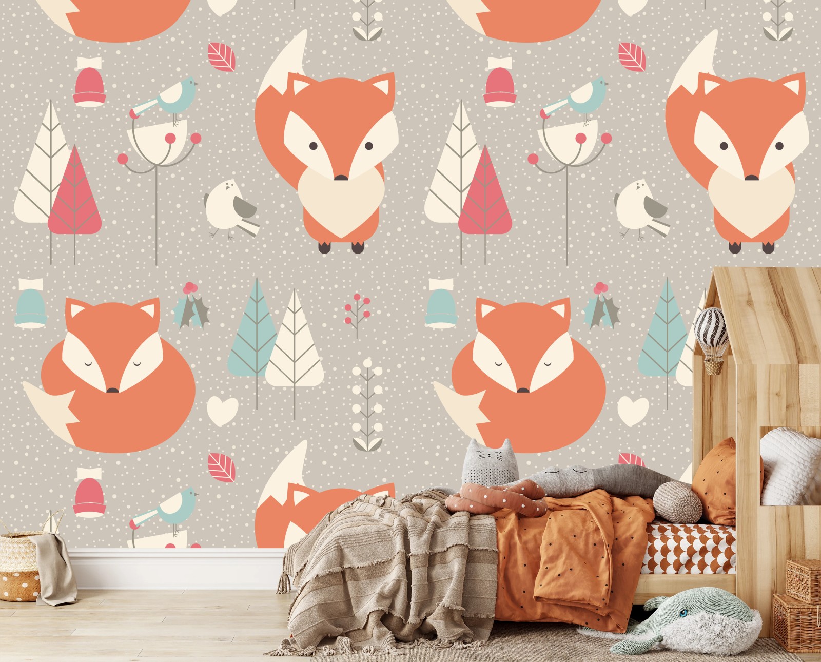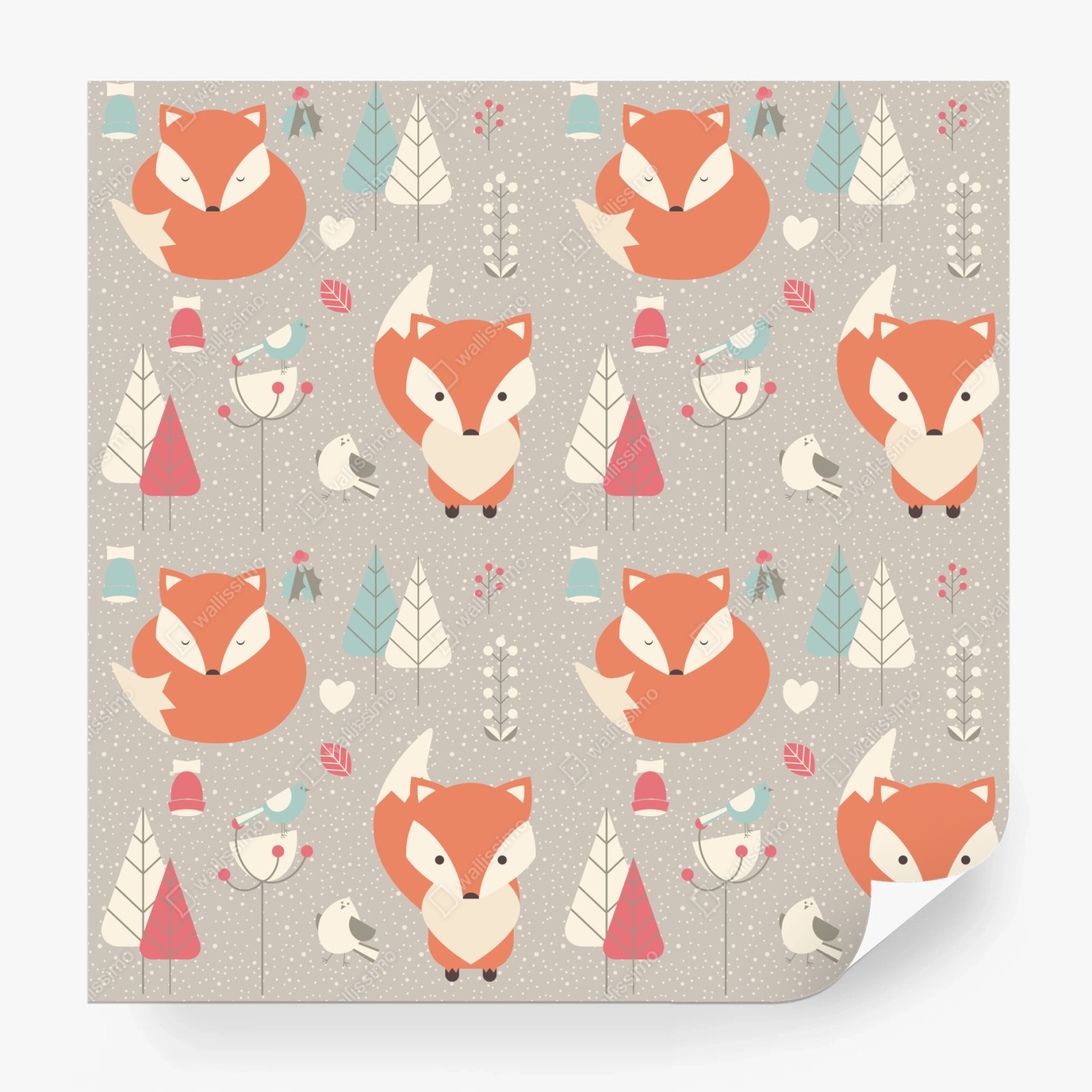 Charmantes pastellfarbenes Muster mit schlafenden Füchsen und Vögeln — sanftes, verspieltes Design für Kinderzimmer.MehrWeniger