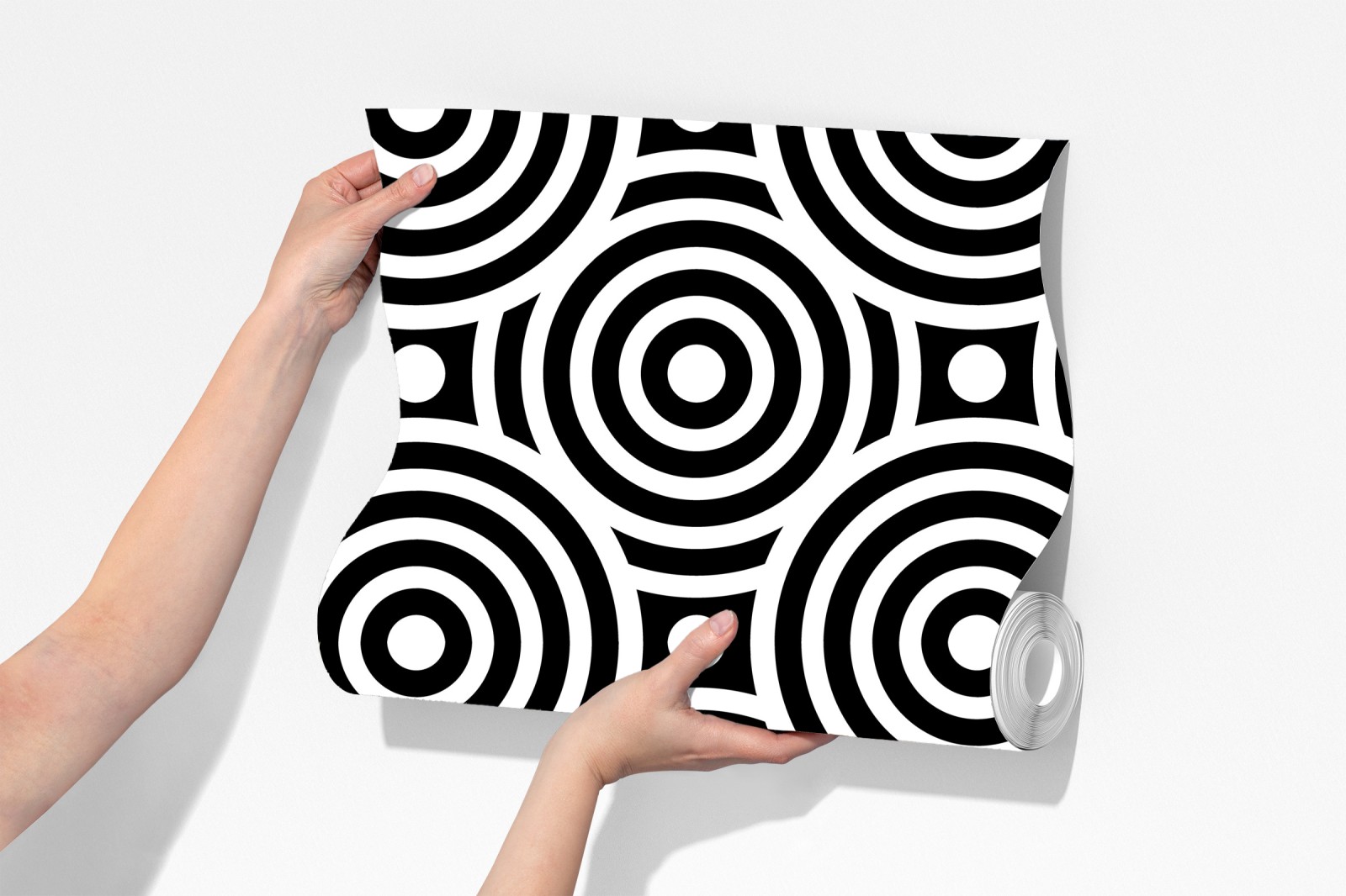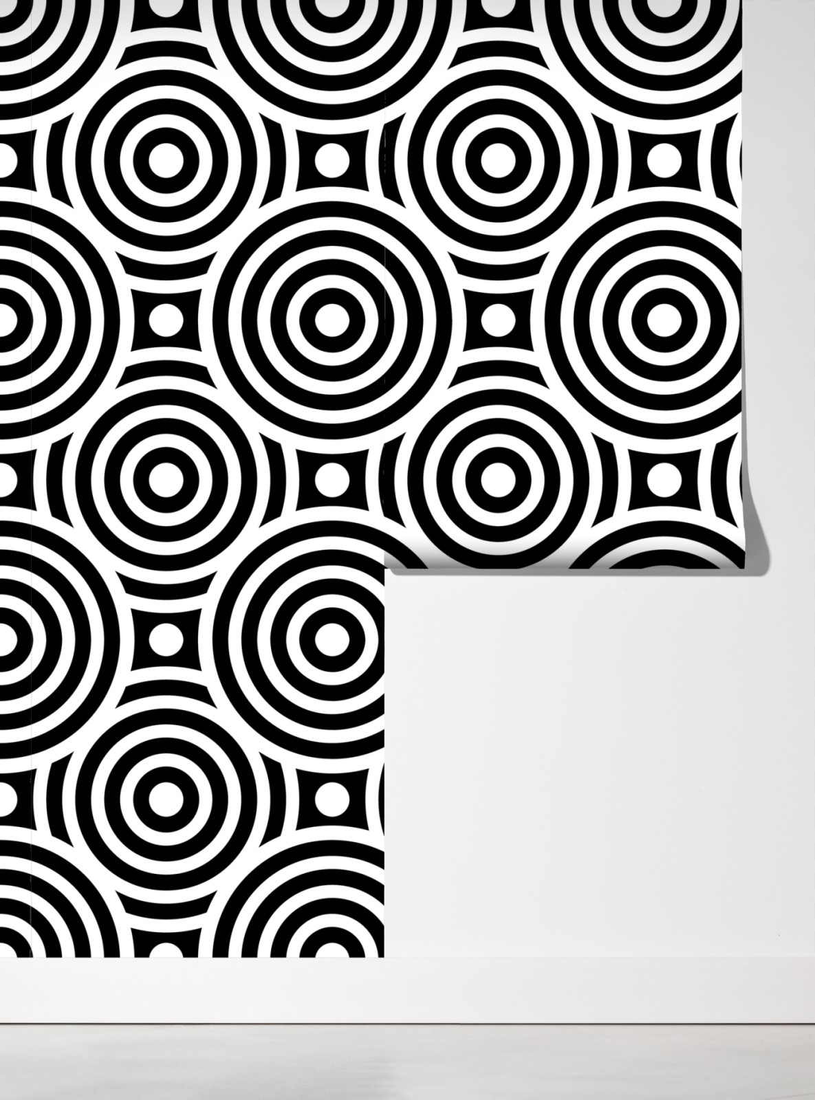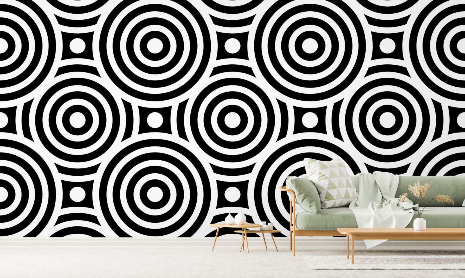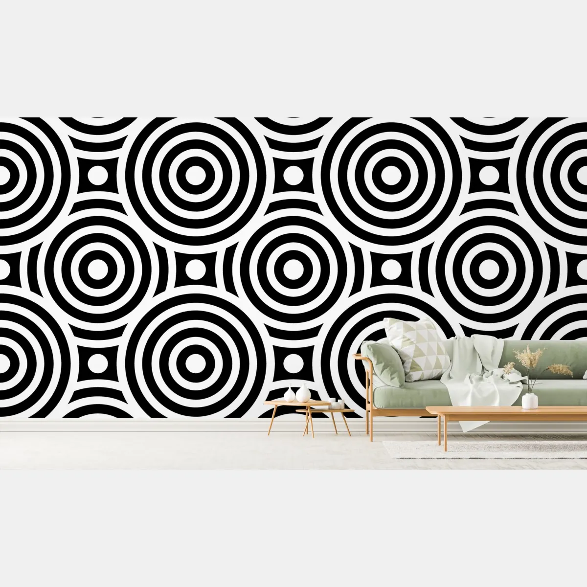 Markantes schwarz-weißes Muster aus konzentrischen Kreisen verleiht jedem Raum eine moderne, grafische Note.