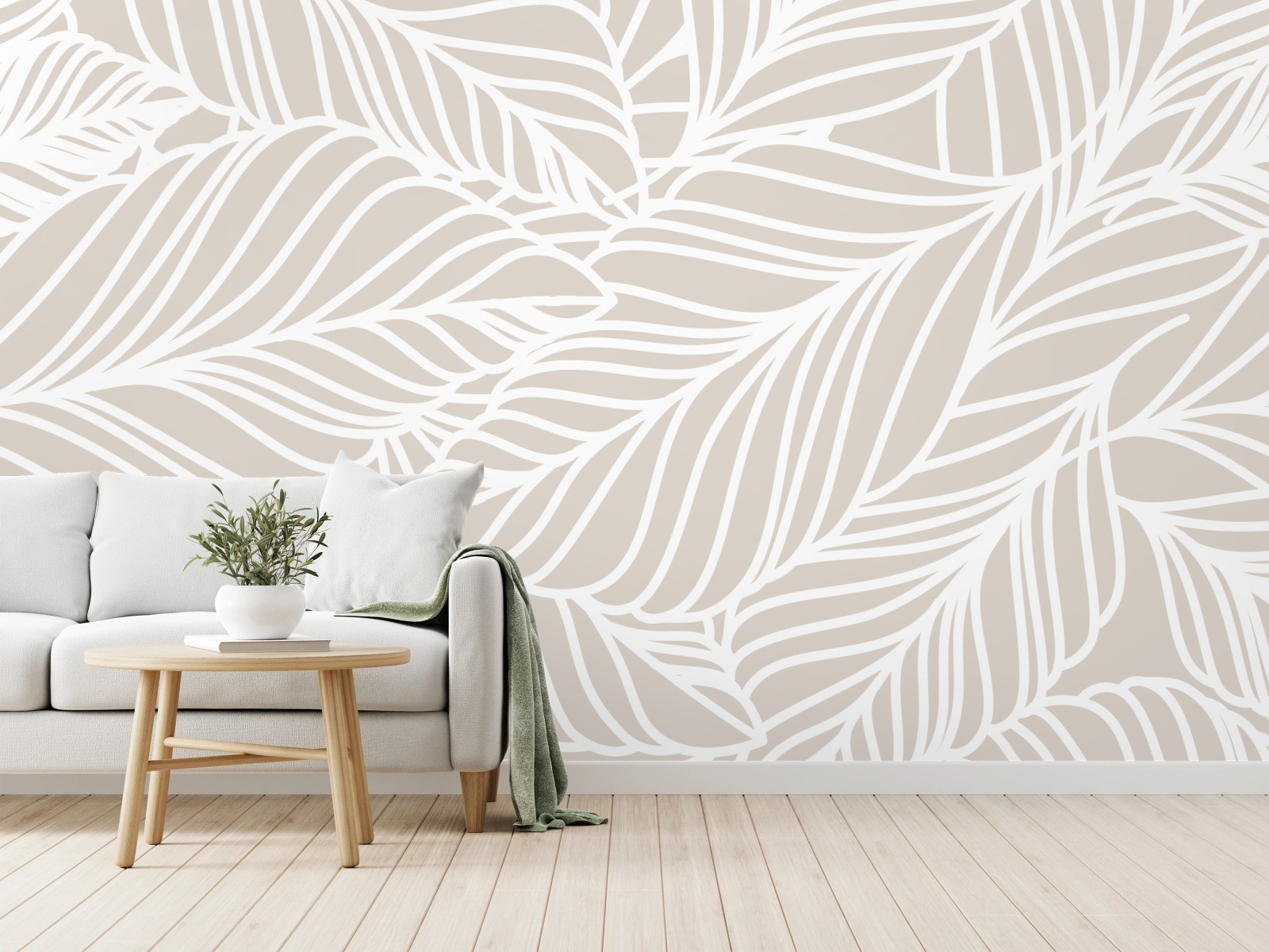 Sanftes beige-weißes Blattmuster schafft eine natürliche, ruhige Atmosphäre und passt zu skandinavischen und minimalistischen Interieurs.MehrWeniger