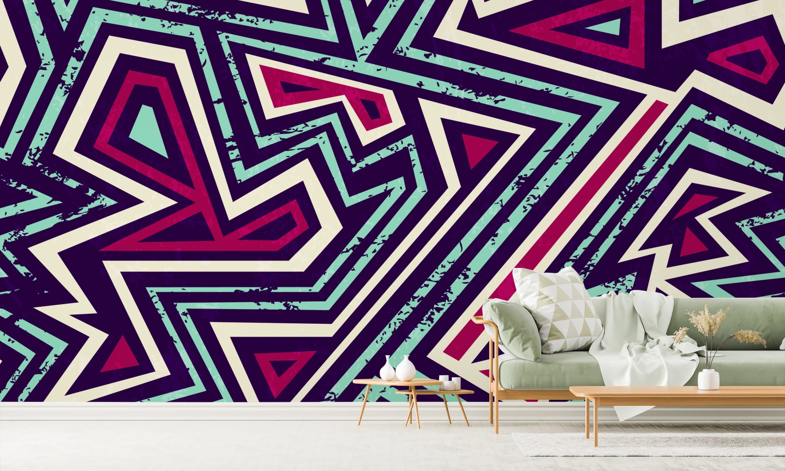 Ein lebhaftes geometrisches Muster mit markanten Dreiecken und kontrastreichen Farben, das moderne Räume belebt.MehrWeniger