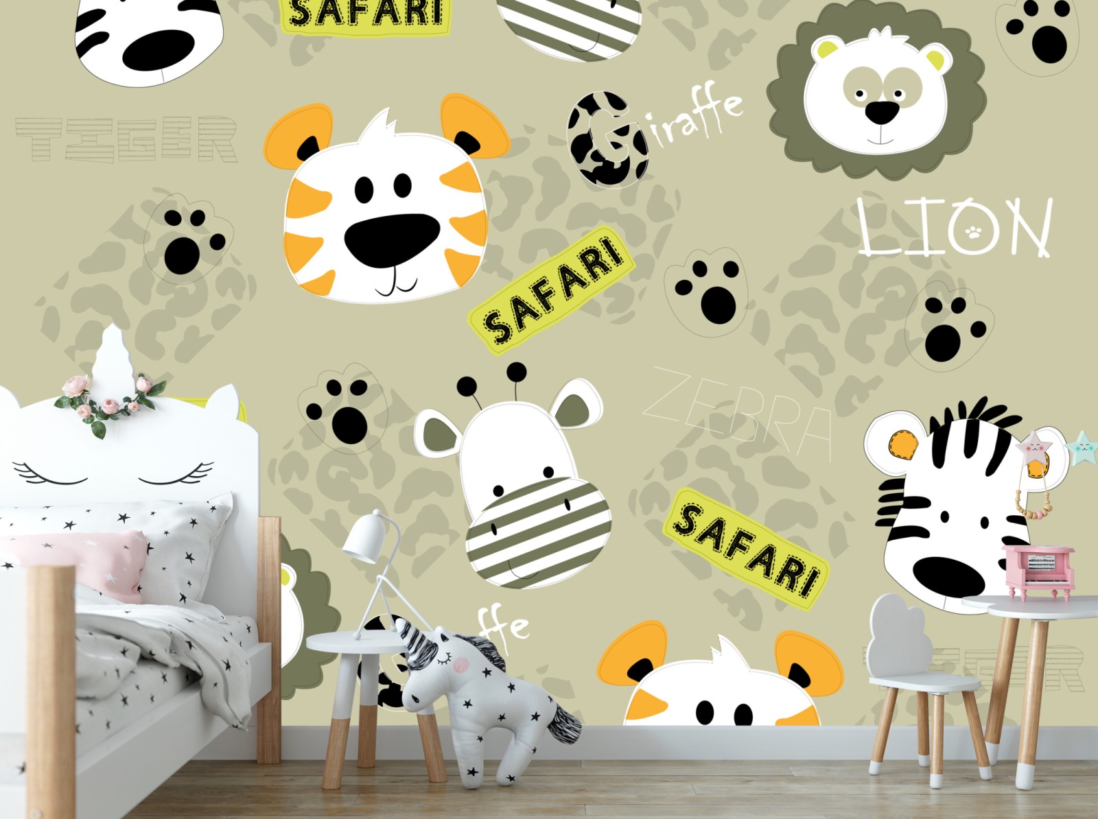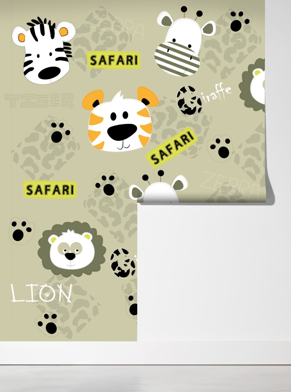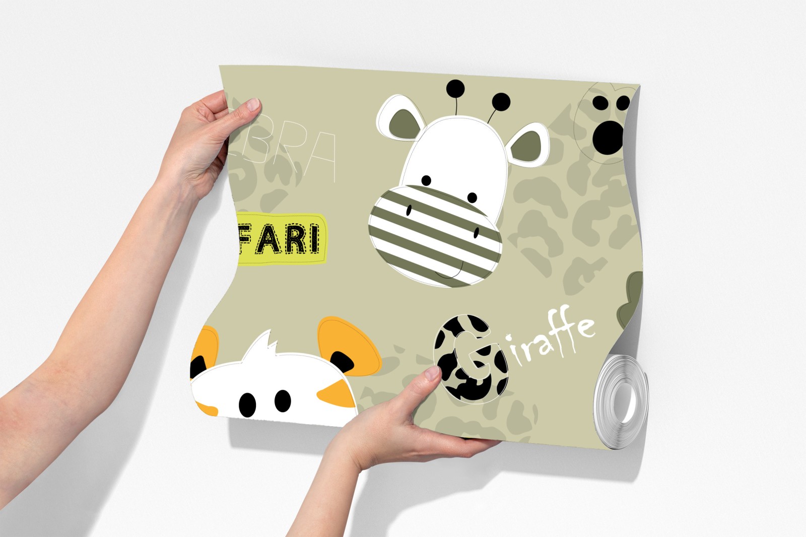 Verspieltes Safari-Tiermuster mit Zebra, Tiger, Giraffe und Löwe auf weichem beigen Hintergrund, ideal für Kinderzimmer.
