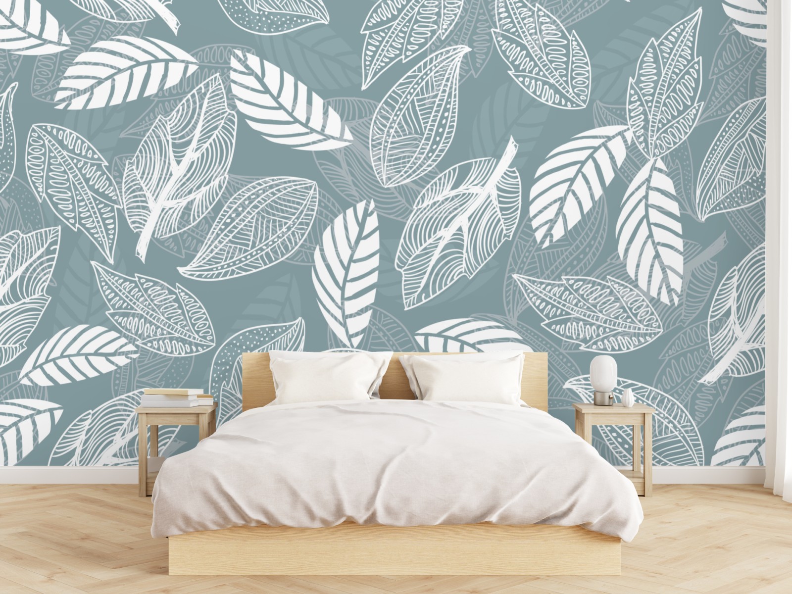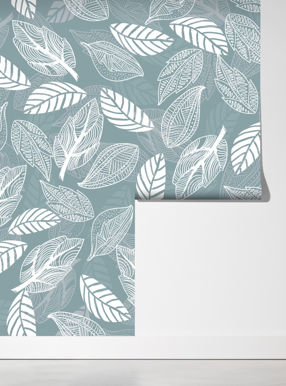 zarte handgezeichnete blätter auf einem gedämpften türkisfarbenen hintergrund schaffen ein beruhigendes botanisches muster, ideal für moderne einrichtungen.
