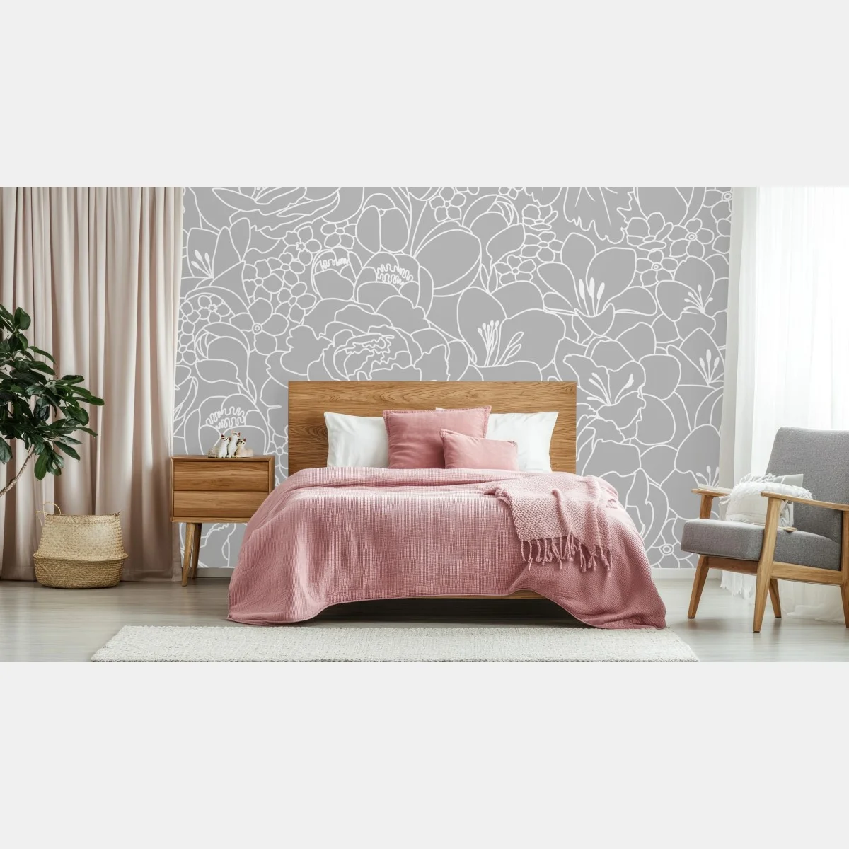 Elegantes monochromes Blumenmuster mit feinen weißen Konturen auf grauem Hintergrund, ideal um einem Raum eine ruhige, moderne Note zu verleihen.MehrWeniger