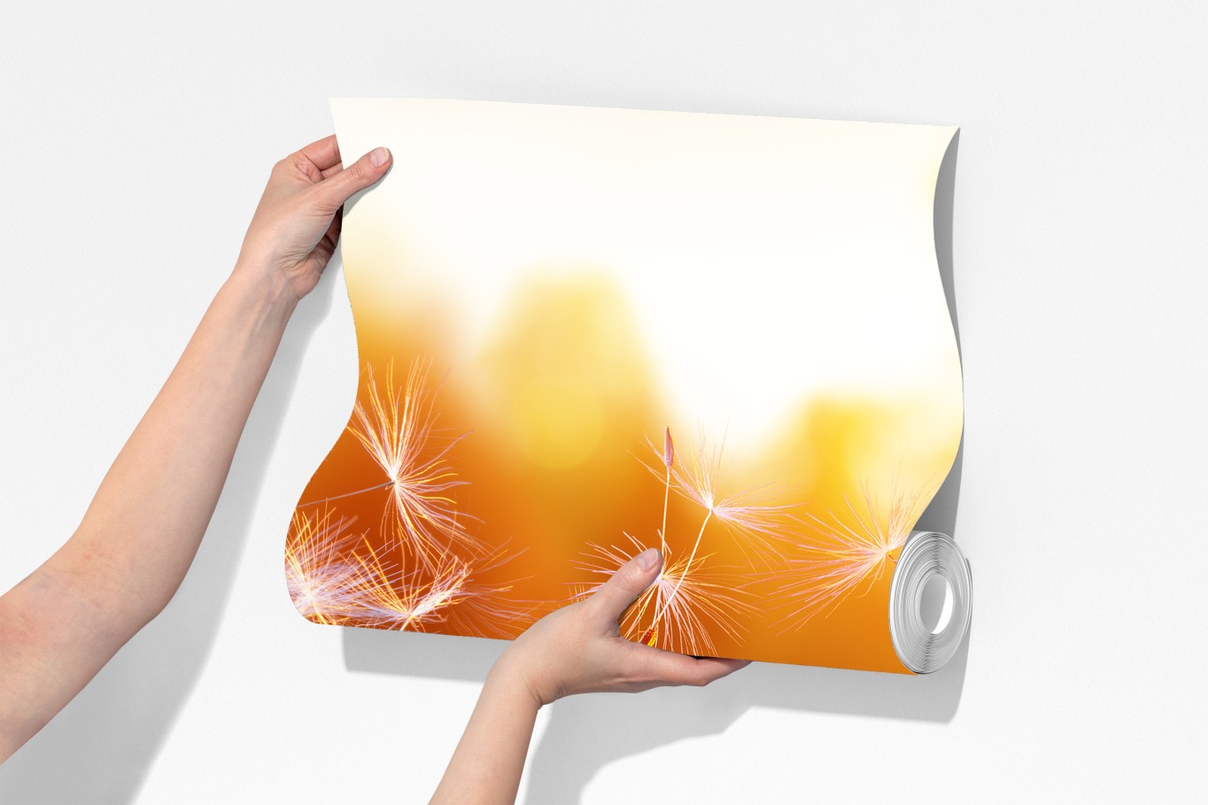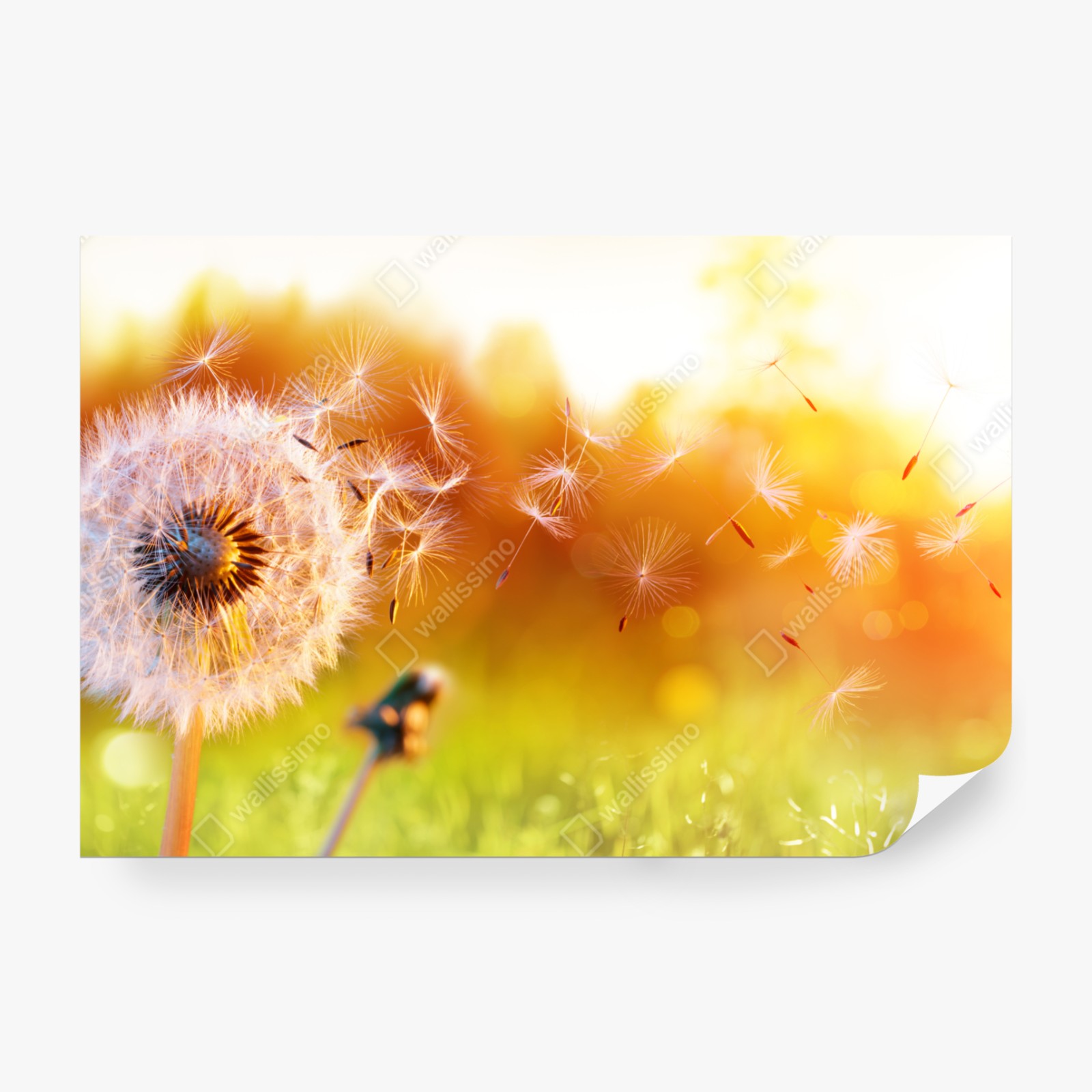 Eine leuchtende Nahaufnahme eines Löwenzahns, dessen Samen im Sonnenuntergang verwehen, bringt Wärme und Ruhe in jeden Raum.