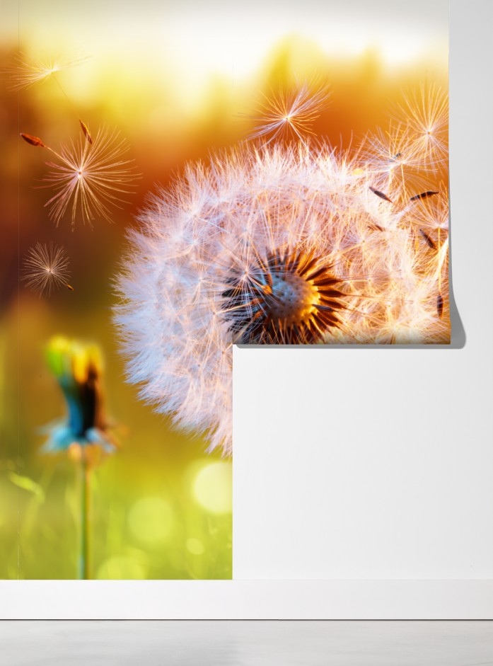 Fototapete goldener löwenzahn im sonnenuntergang