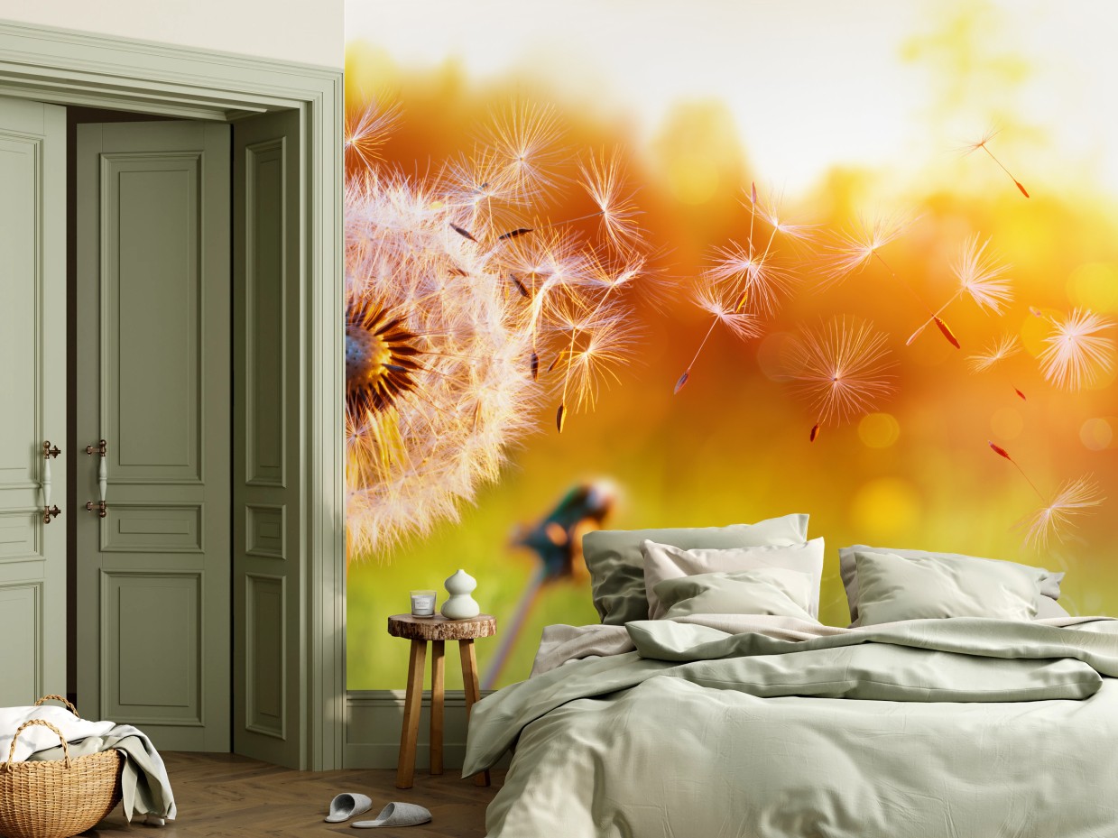 Fototapete Goldener löwenzahn im sonnenuntergang