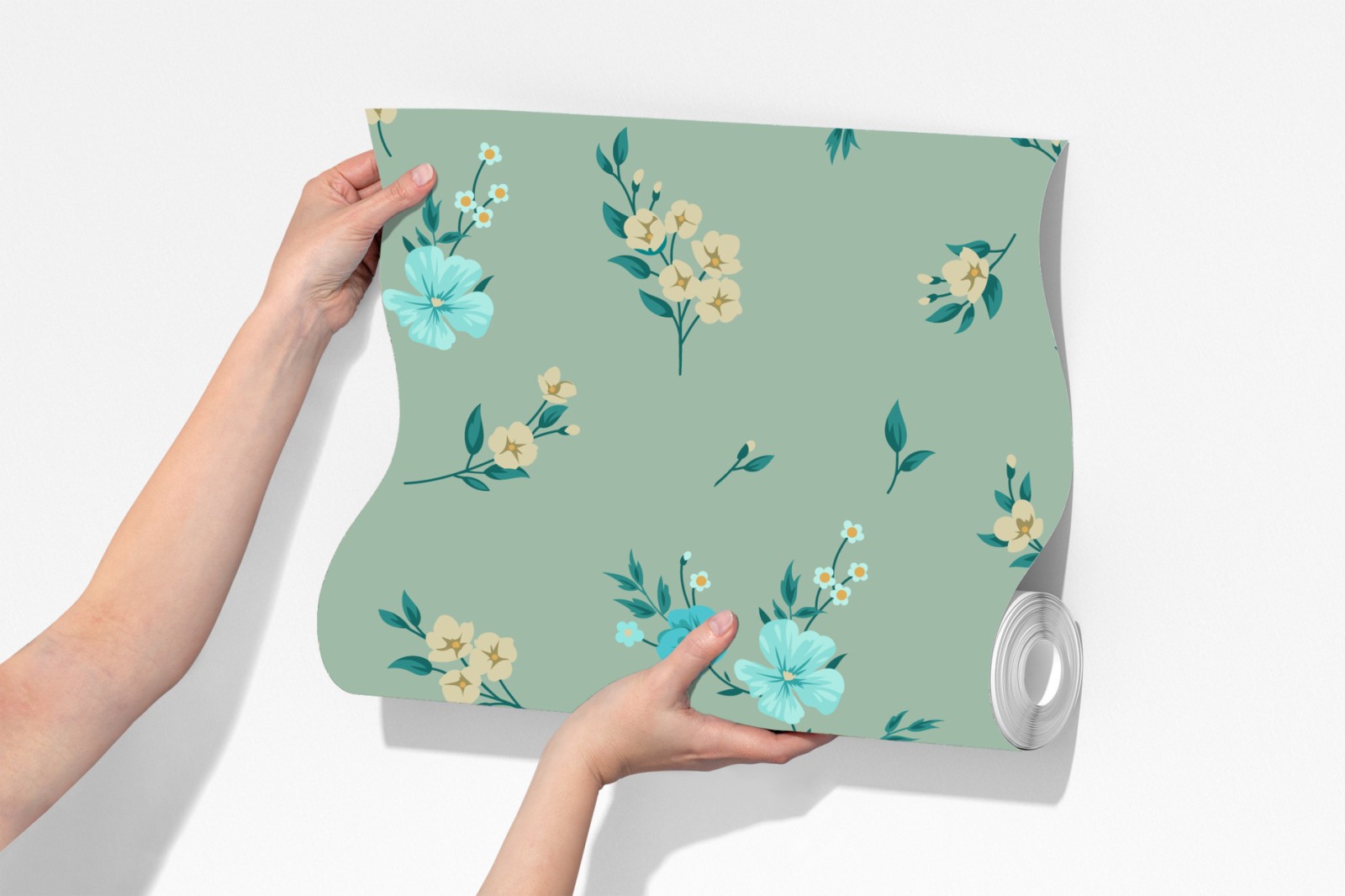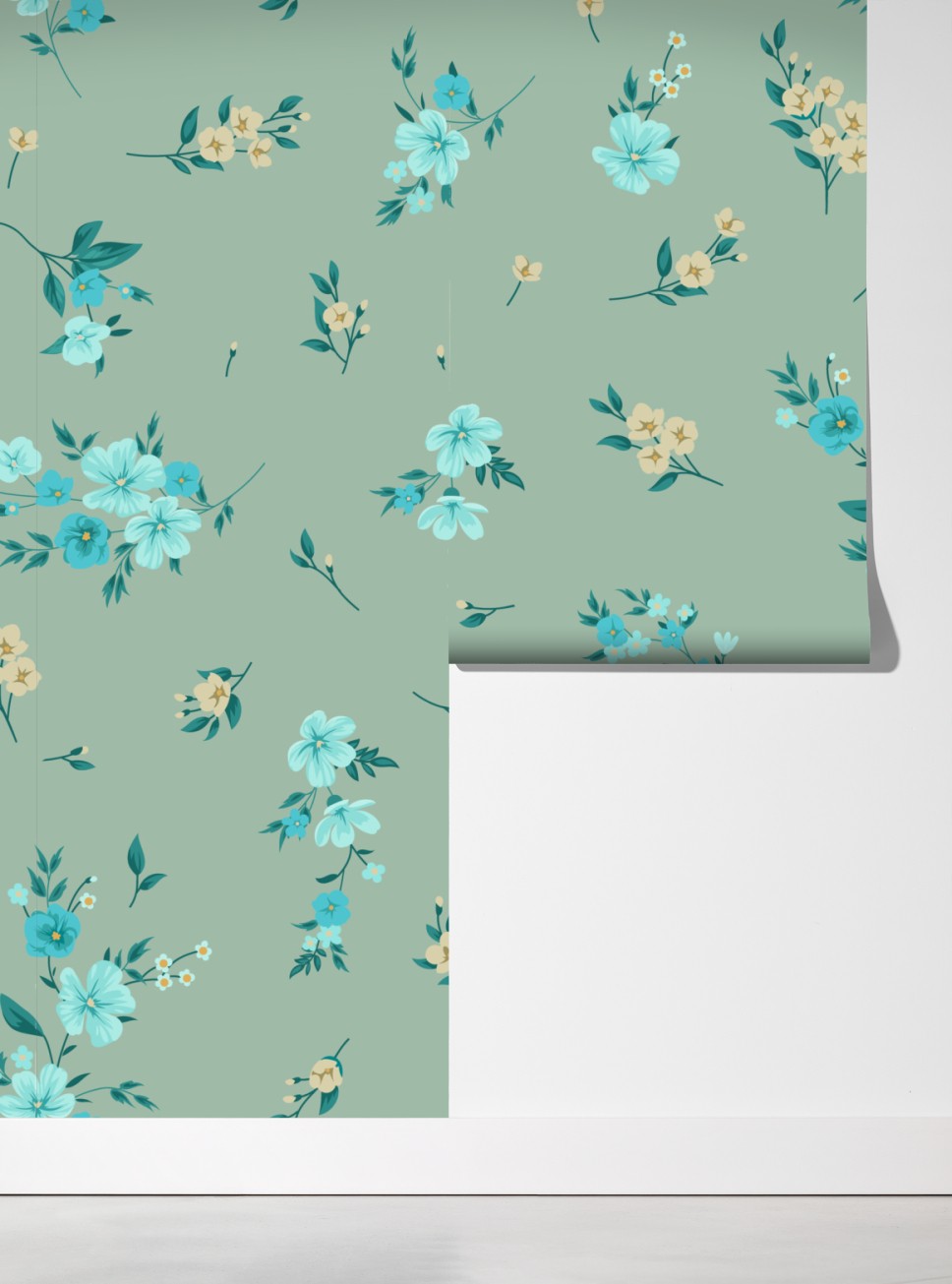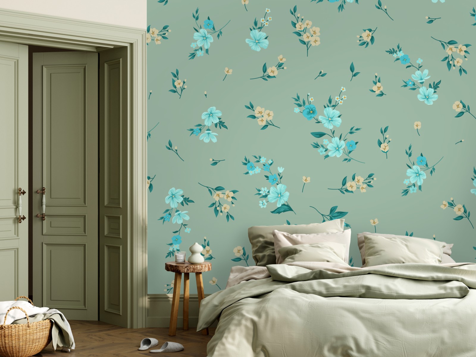 Fototapete pastell türkis blumenmuster auf salbeigrünem hintergrund