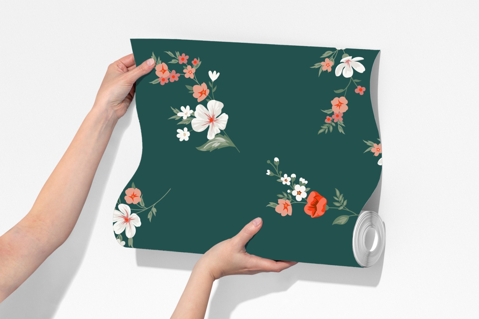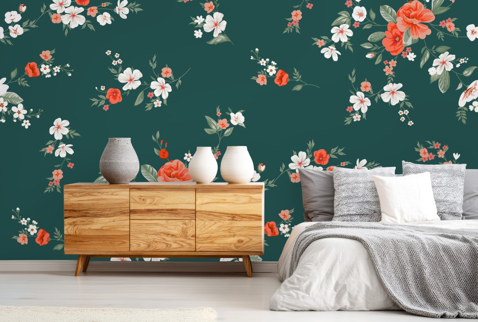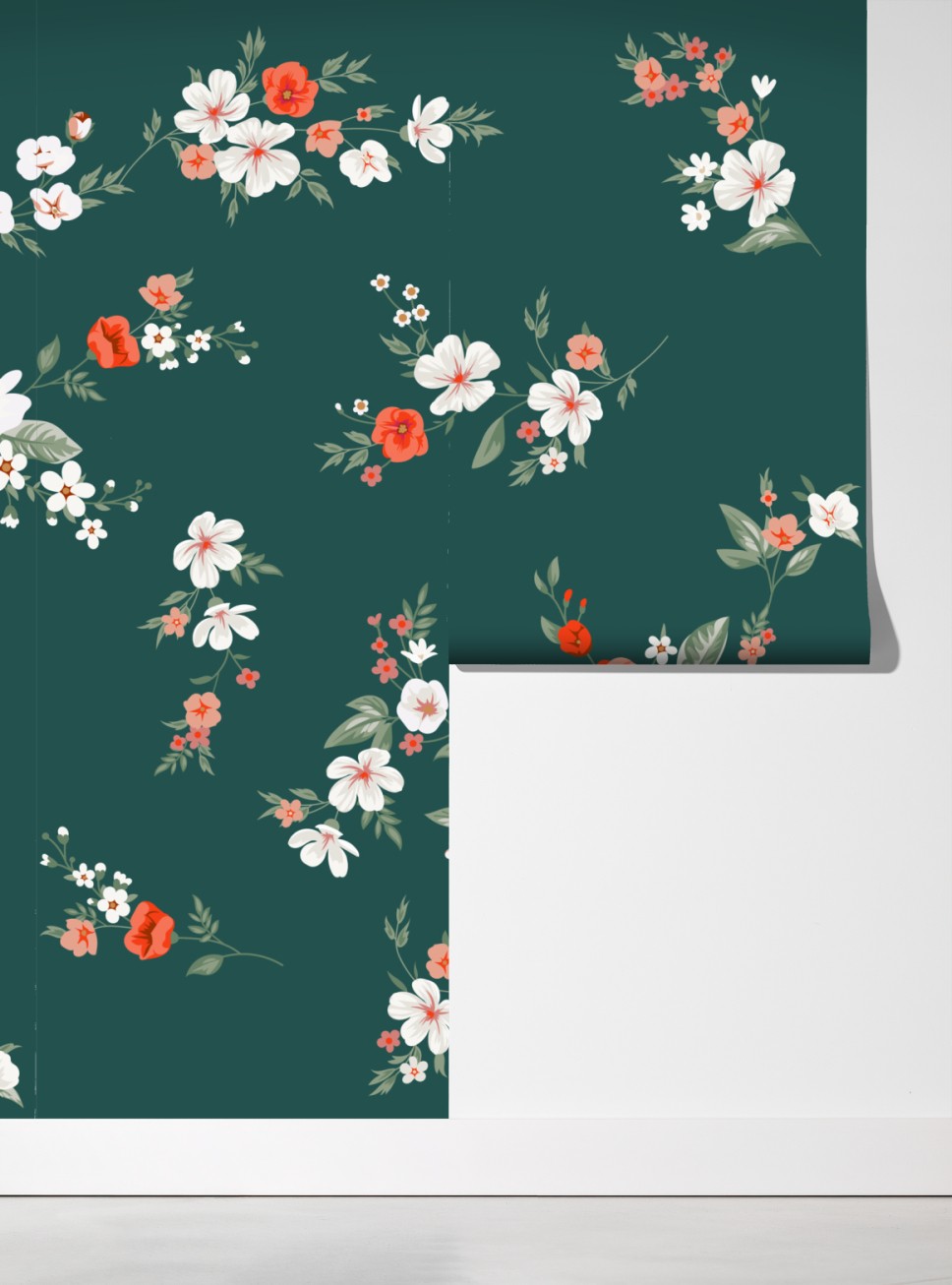 Zarte korallenrote und weiße Blüten auf tiefgrünem Hintergrund verleihen jedem Raum einen vintage-botanischen Charme.