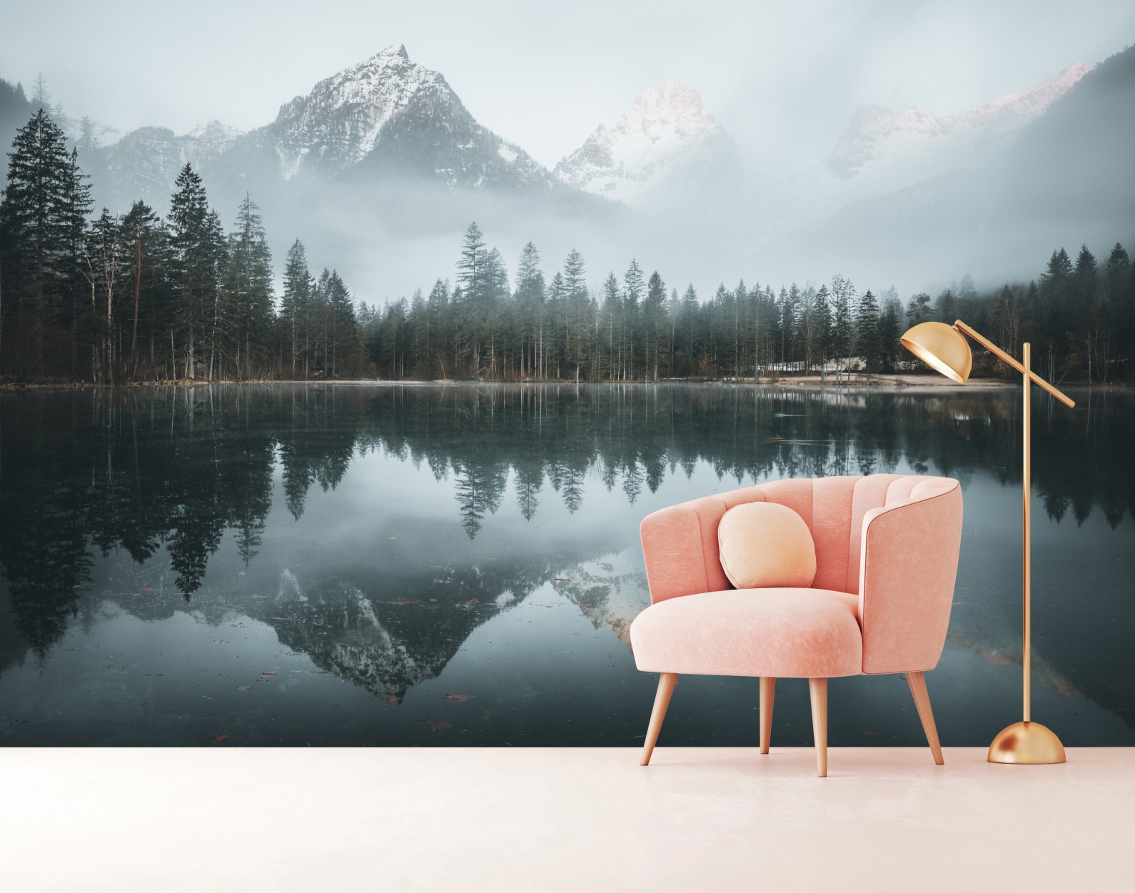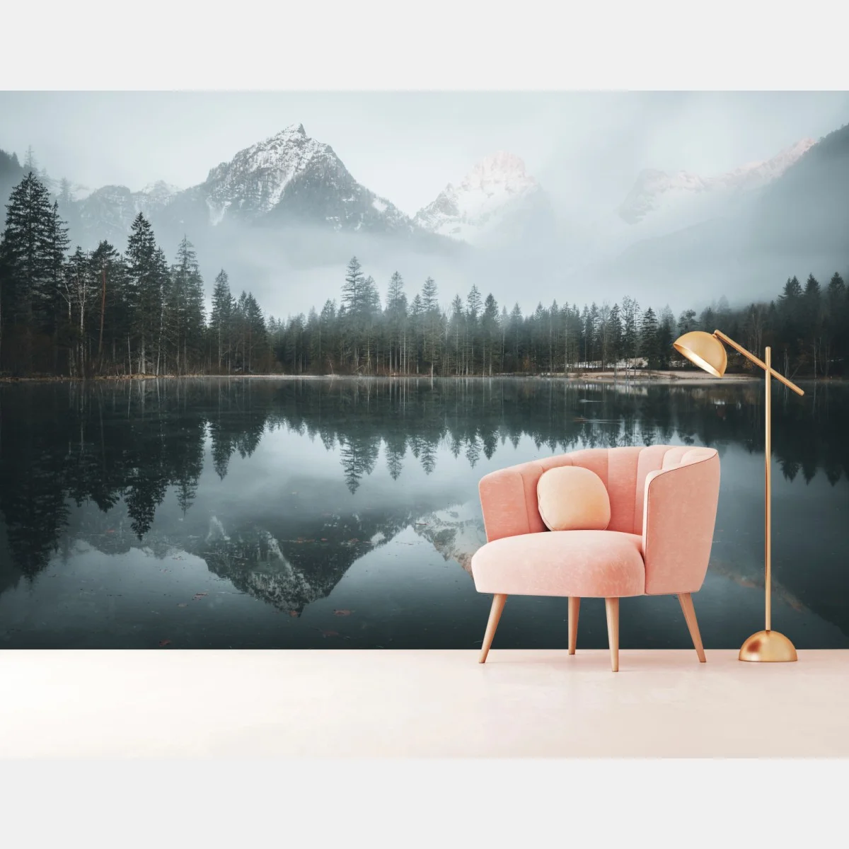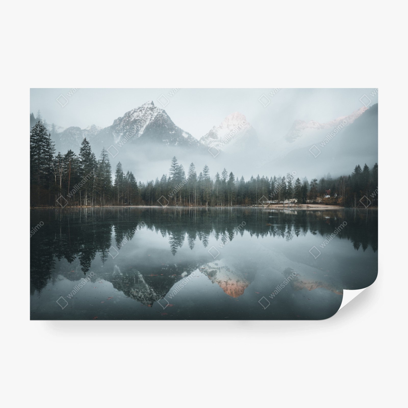 Fototapete Neblige alpine spiegelung am ruhigen see