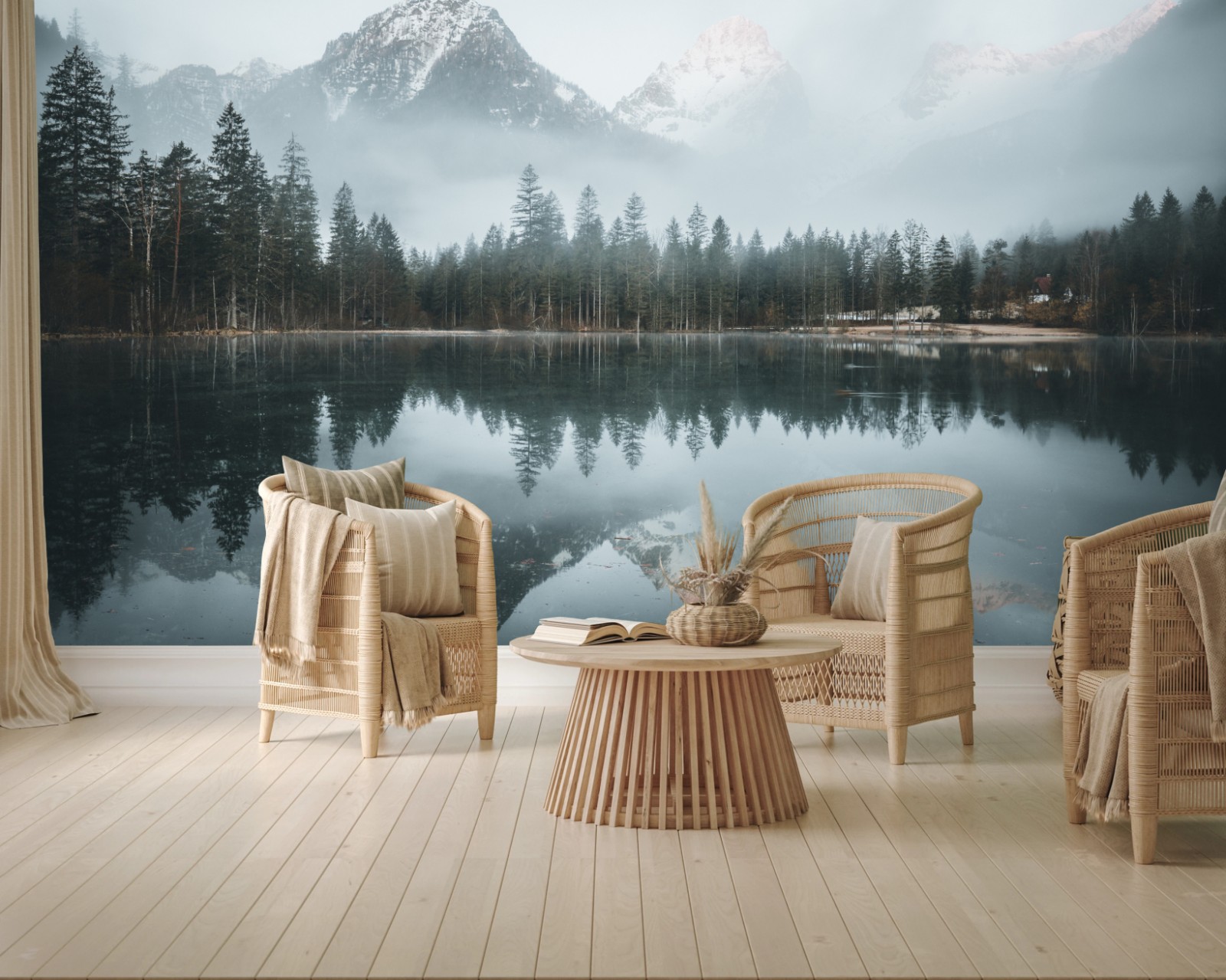 Fototapete Neblige alpine spiegelung am ruhigen see