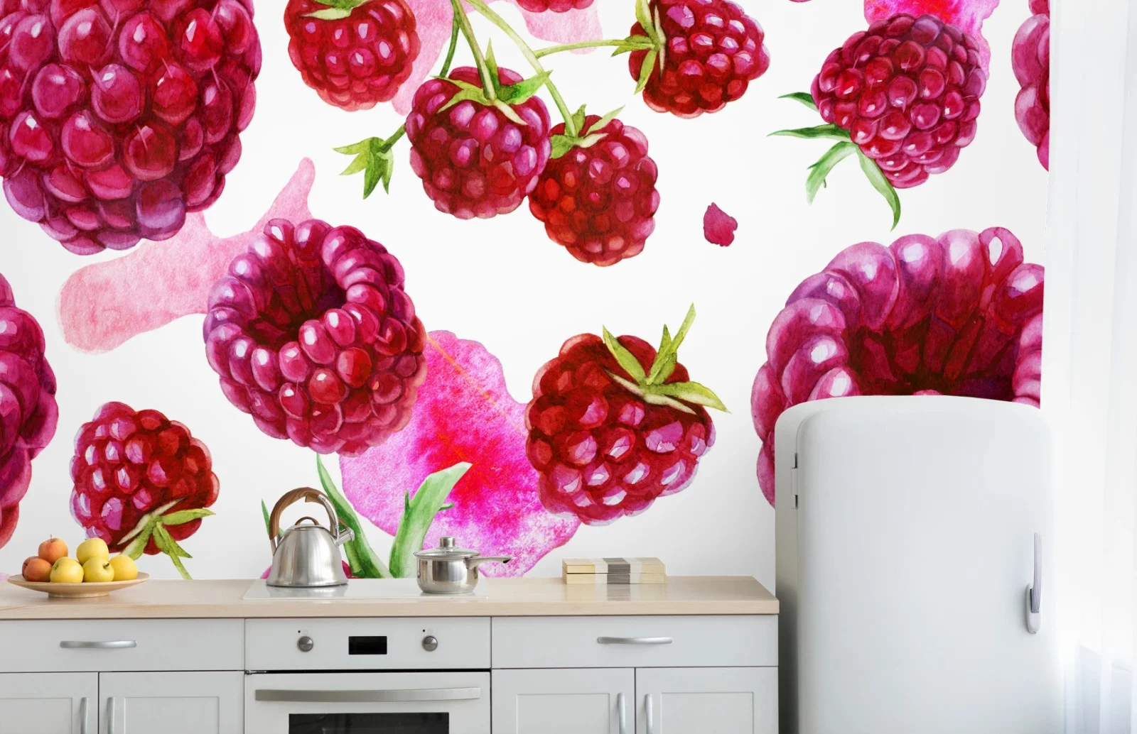 lebhafte aquarell himbeeren bilden ein frisches, verspieltes muster, das küche und esszimmer aufhellt.MehrWeniger