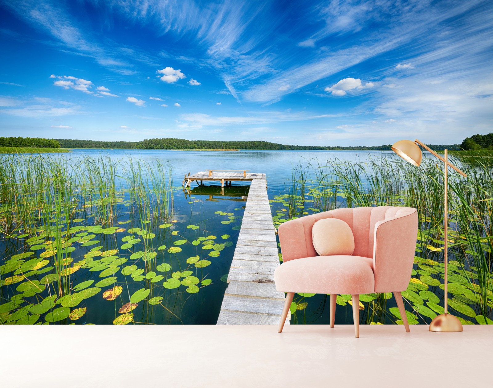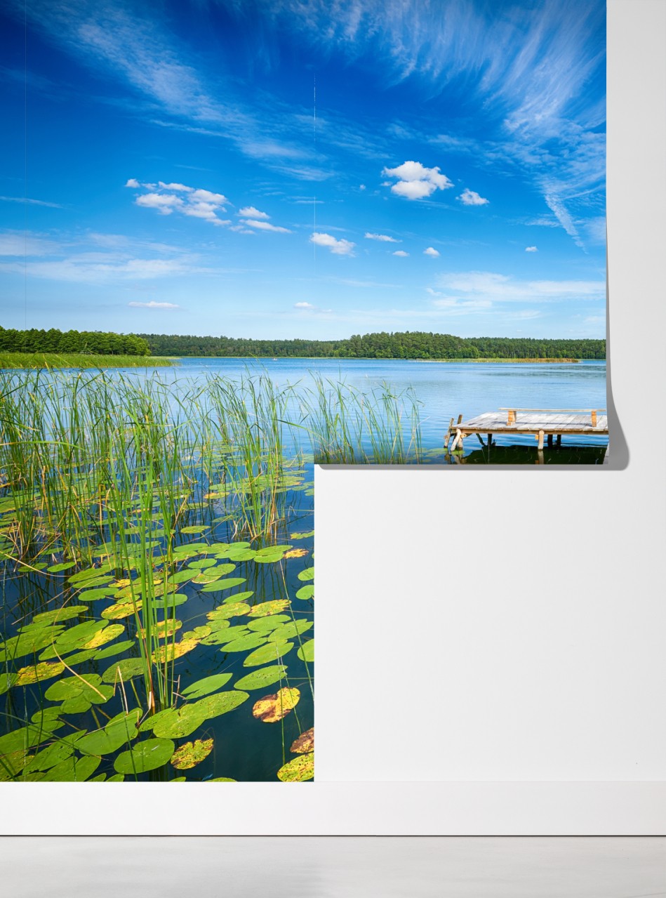 Ruhige Sommerlandschaft mit Holzsteg, Seerosen und klarem blauem Himmel, perfekt, um natürliche Ruhe in Ihr Zuhause zu bringen.