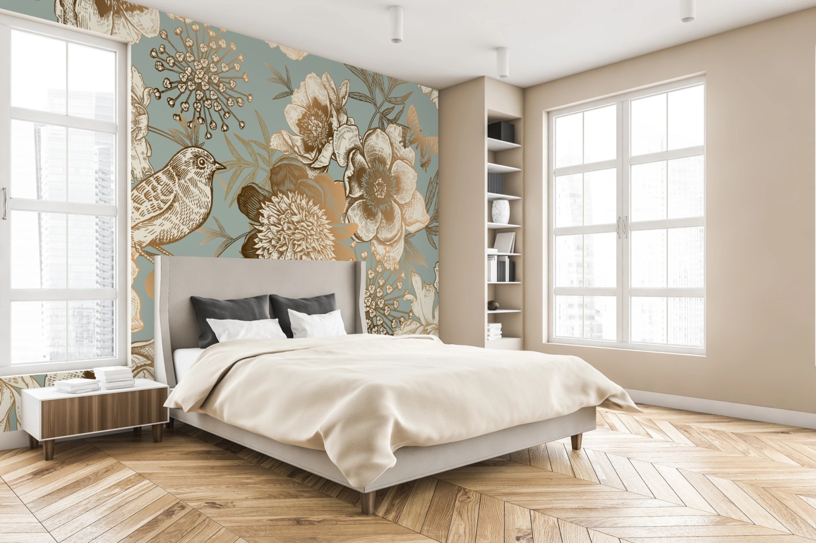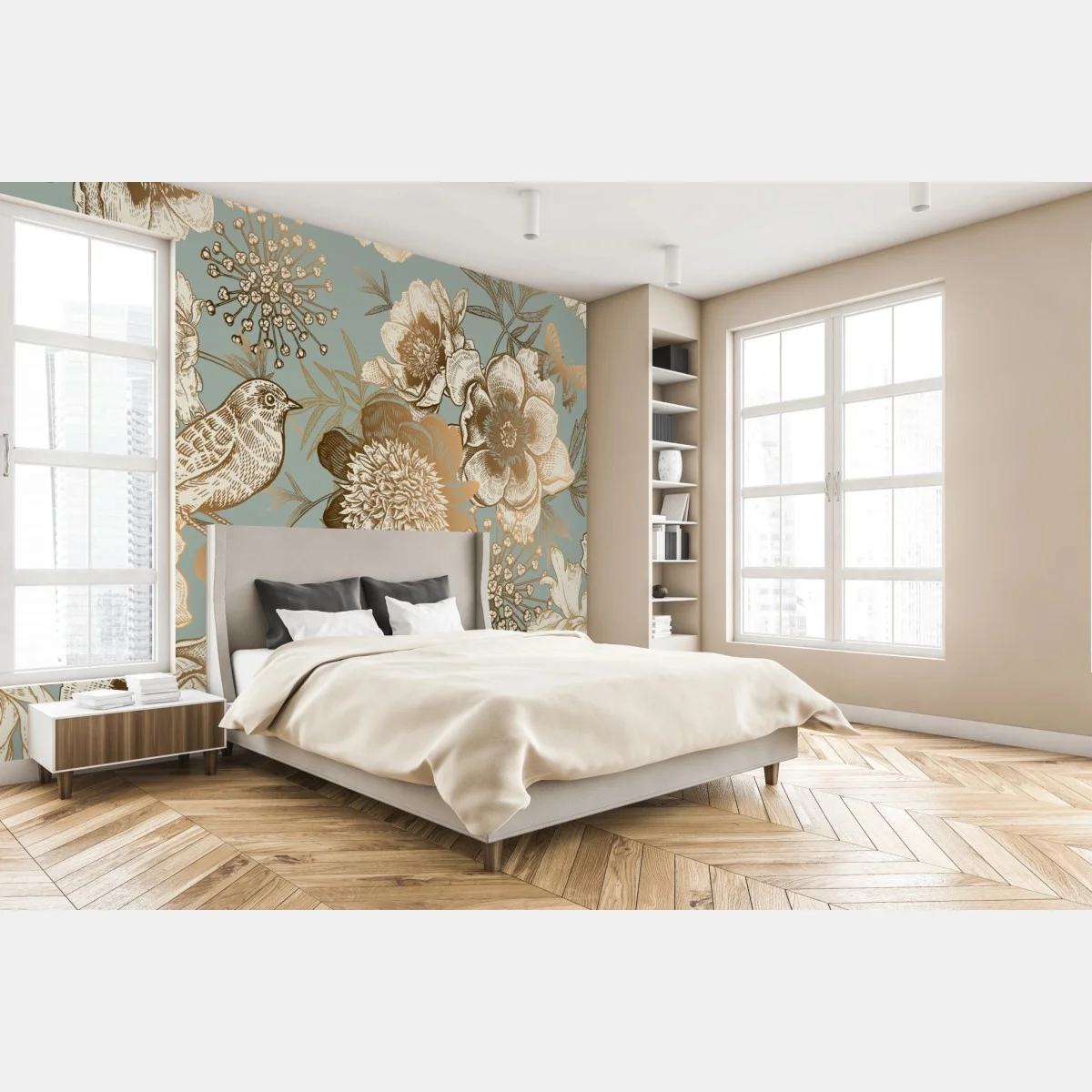 Fototapete Vintage botanisches blumenmotiv mit vogel