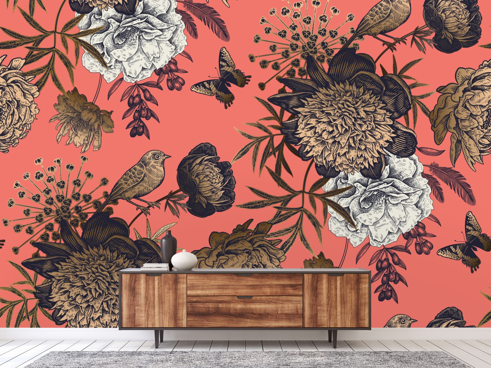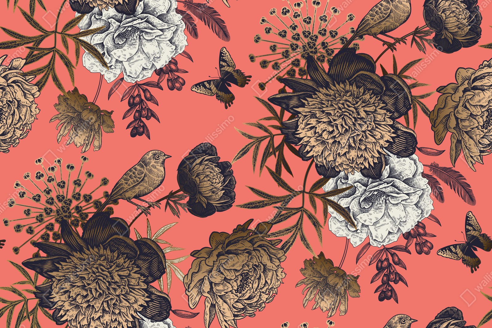 Fototapete vintage blumenmuster mit vögeln auf korallenhintergrund
