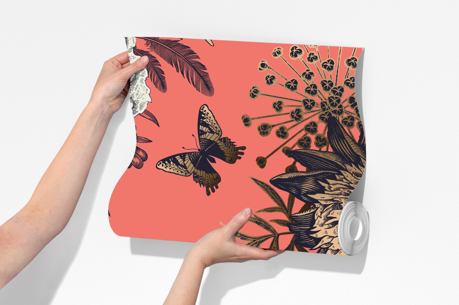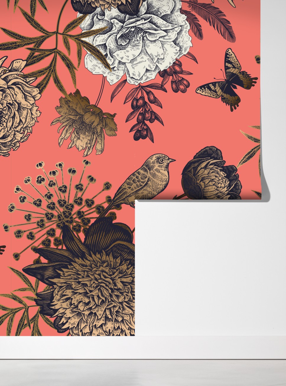 Ornates vintage blumenmuster mit vögeln und schmetterlingen auf korallenhintergrund verleiht jedem interieur wärme und charakter und schafft einen gemütlichen blickfang.