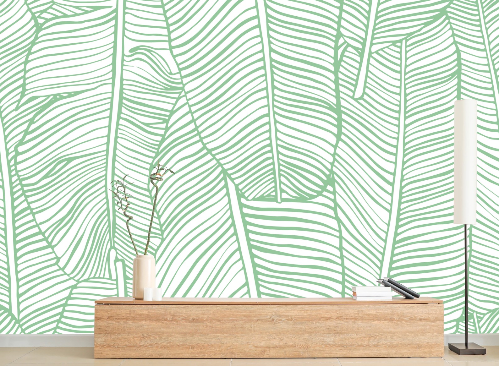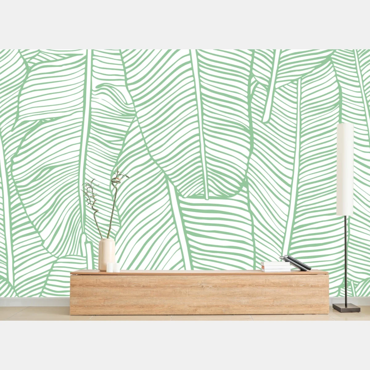 das mintfarbene bananenblattmuster verleiht jedem raum eine beruhigende tropische stimmung und moderne botanische eleganz.MehrWeniger