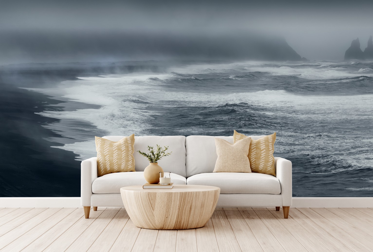 Bringen Sie dramatische Küstenenergie in Ihren Raum mit diesem Panorama eines stürmischen Vulkanstrandes in Island, das kraftvolle Wellen, schwarzen Sand und düstere, bewölkte Himmel zeigt.