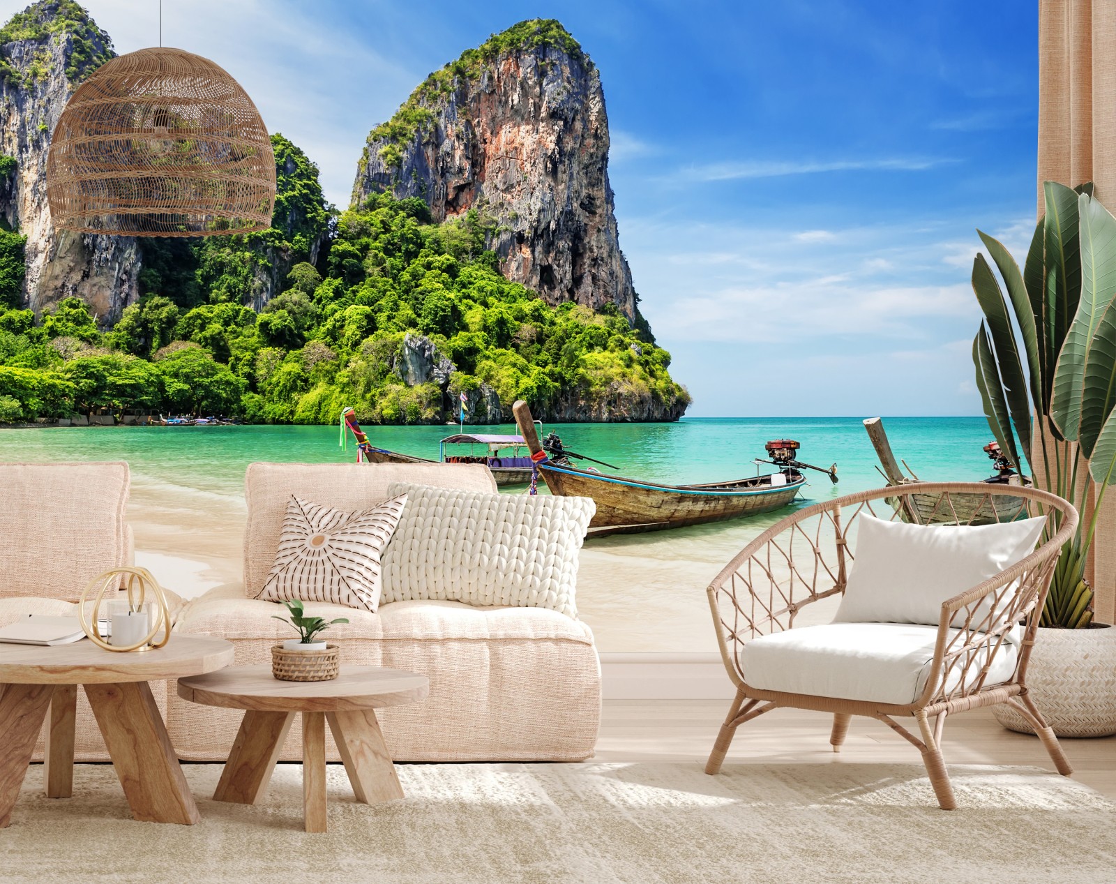 Fototapete Ruhige longtail-boote am strand von Railay, Thailand