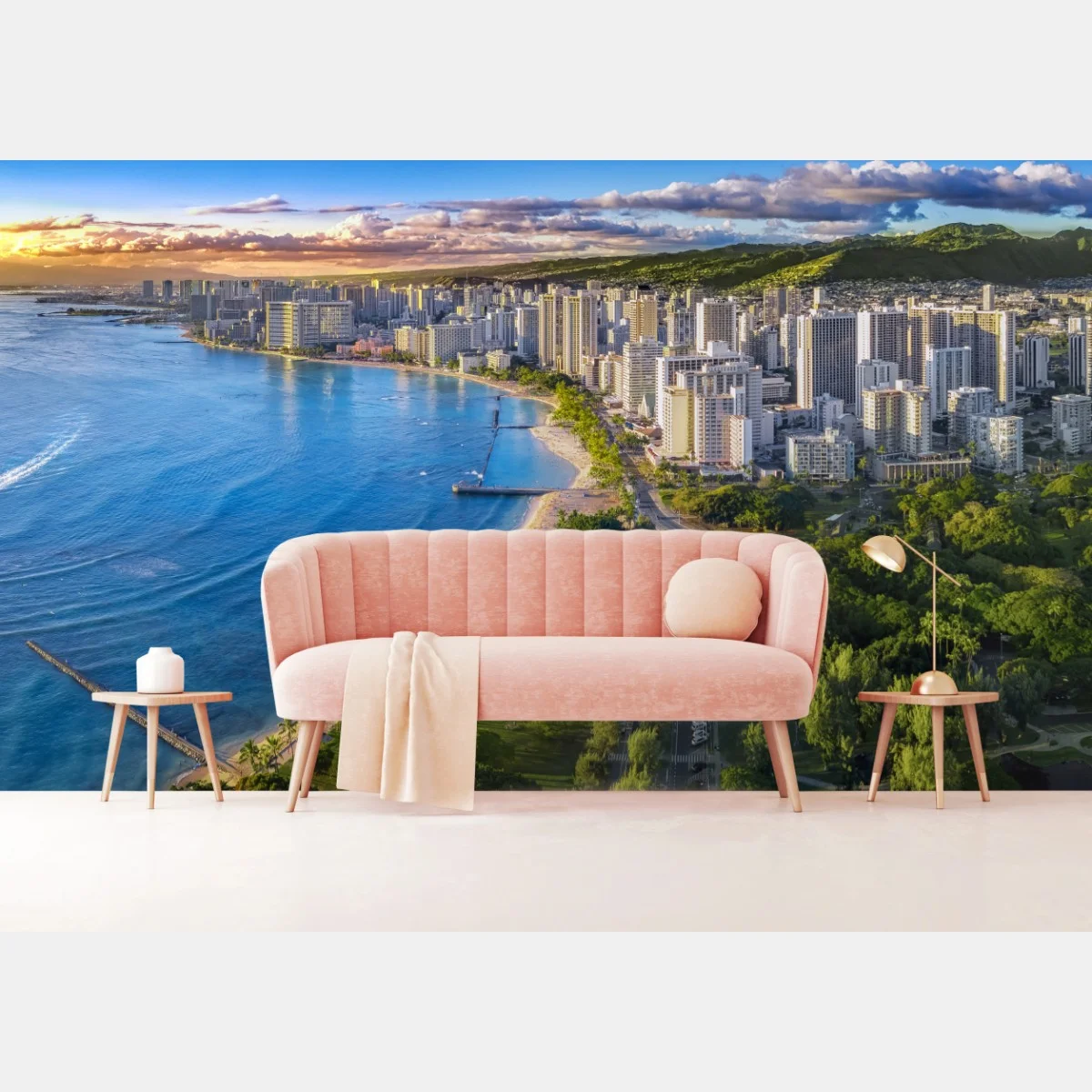 Fototapete Skyline einer küstenstadt bei sonnenuntergang