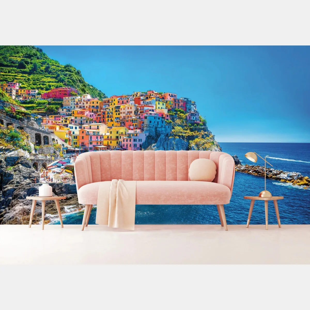Bringen Sie maritimen, farbenfrohen Charme in Ihr Zuhause mit diesem lebendigen Foto eines bunten Dorfes auf den Klippen über dem tiefblauen Meer.MehrWeniger