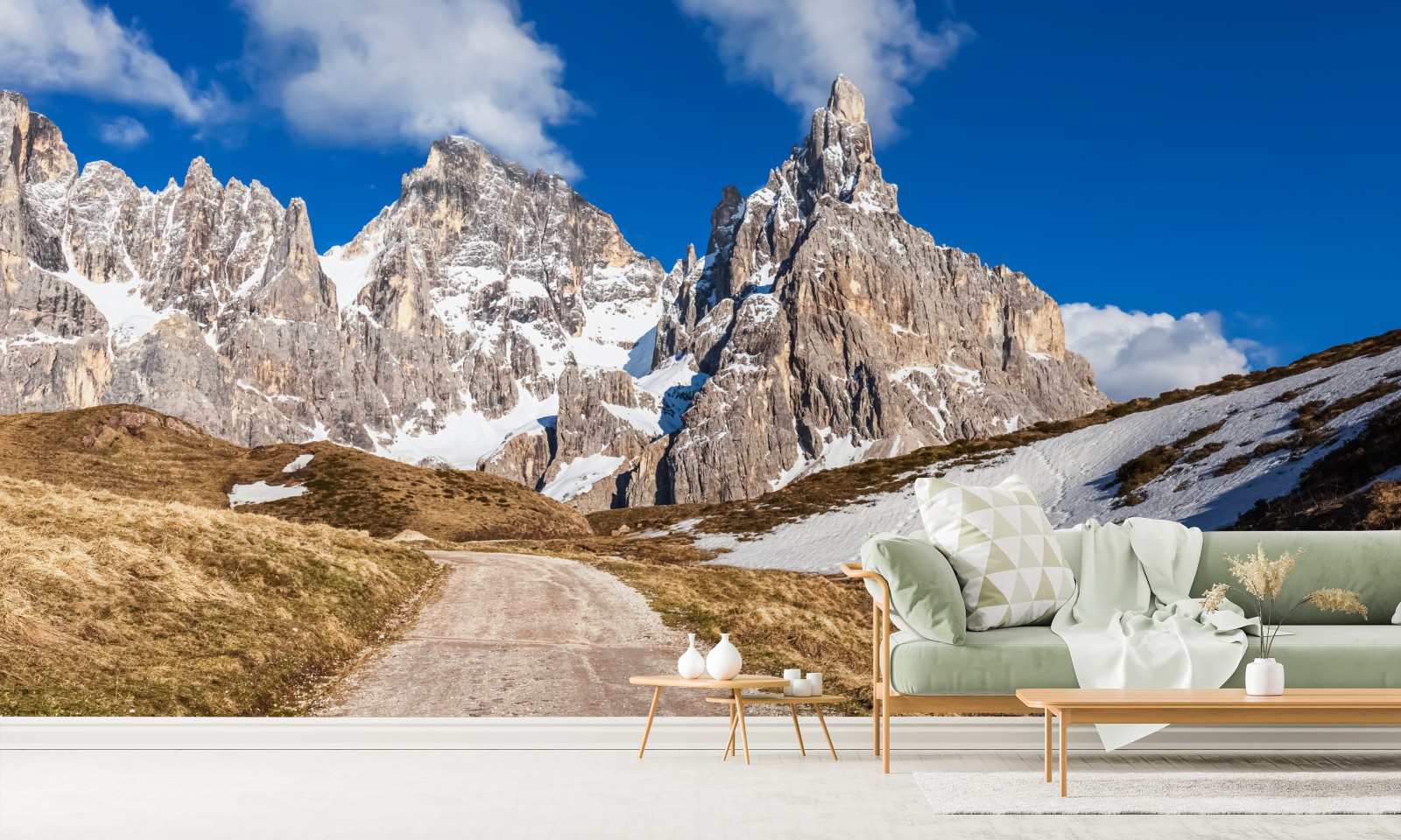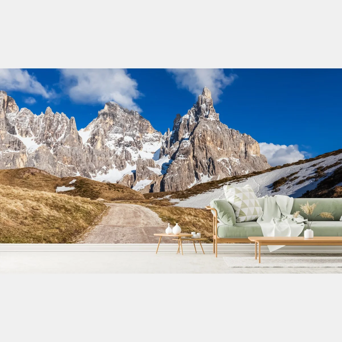 Bringen Sie die Ruhe hochalpiner Landschaften in Ihr Zuhause mit diesem lebendigen Druck, der schroffe Gipfel, einen gewundenen Weg und strahlend blauen Himmel zeigt.MehrWeniger