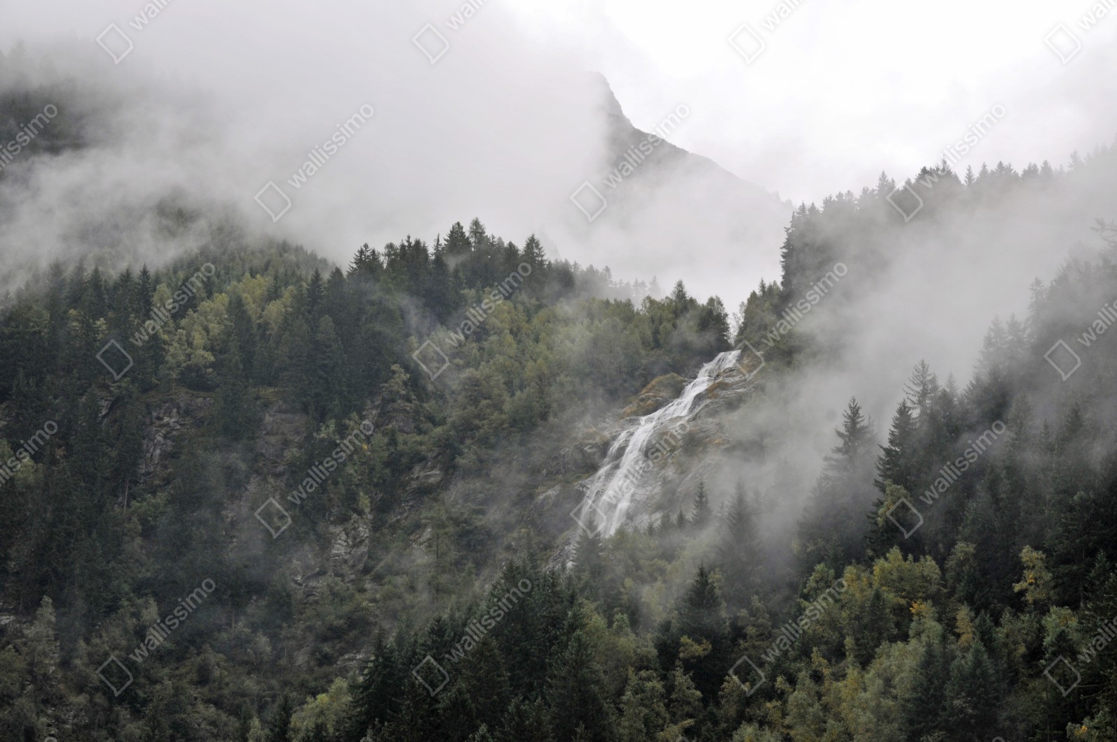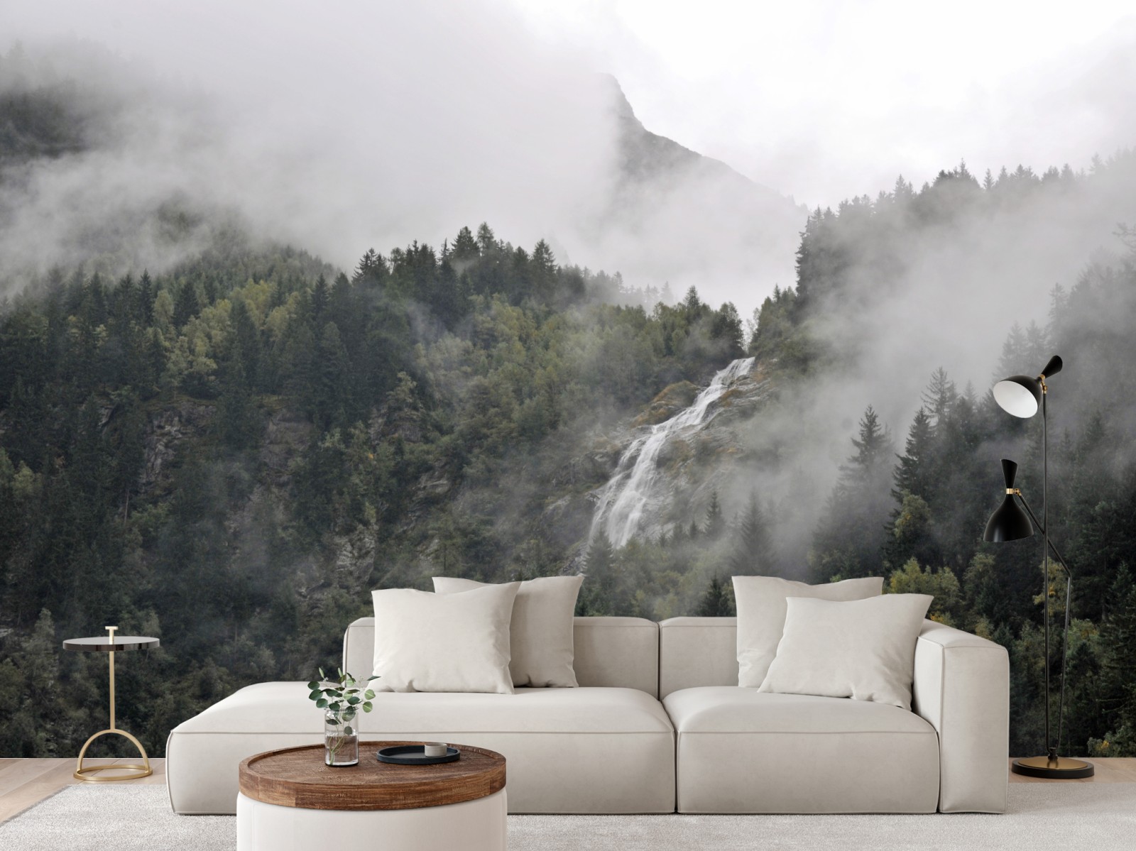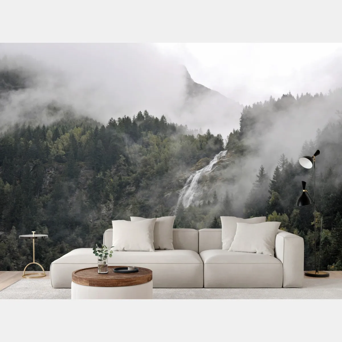 Ein nebelverhangener wasserfall, der durch dichten, grünen bergwald fließt und jedem raum eine ruhige, naturnahe atmosphäre verleiht.