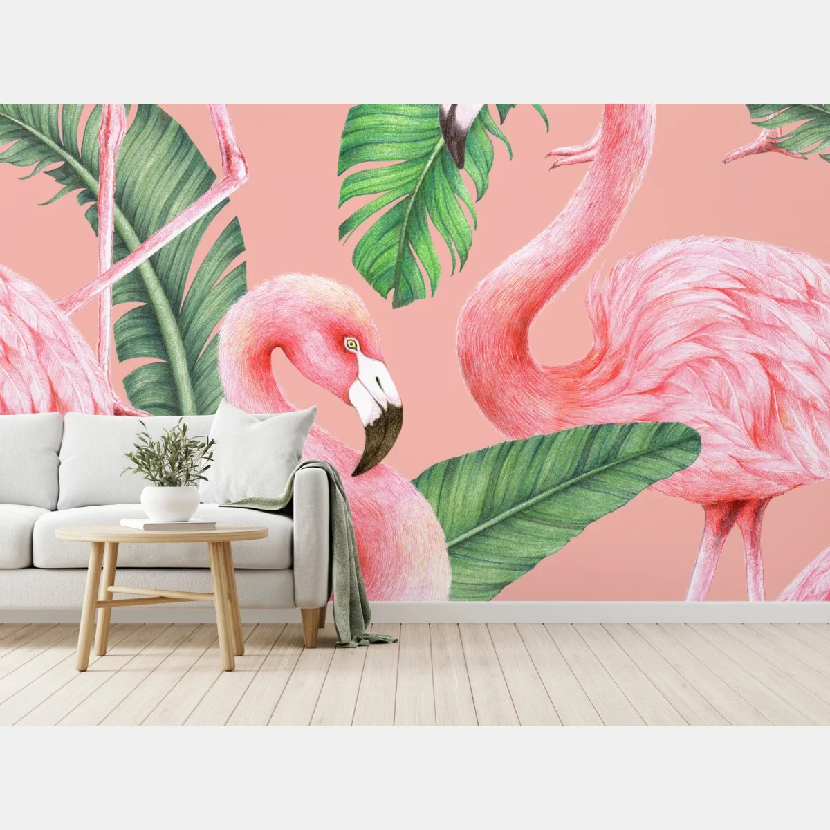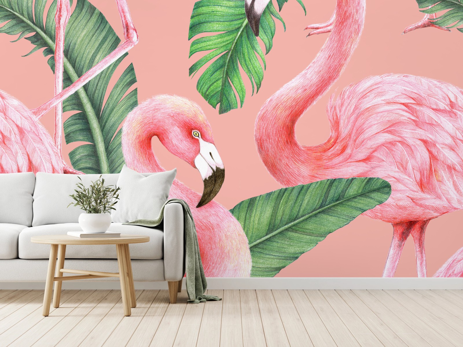 Fototapete Rosa flamingo muster mit tropischen blättern