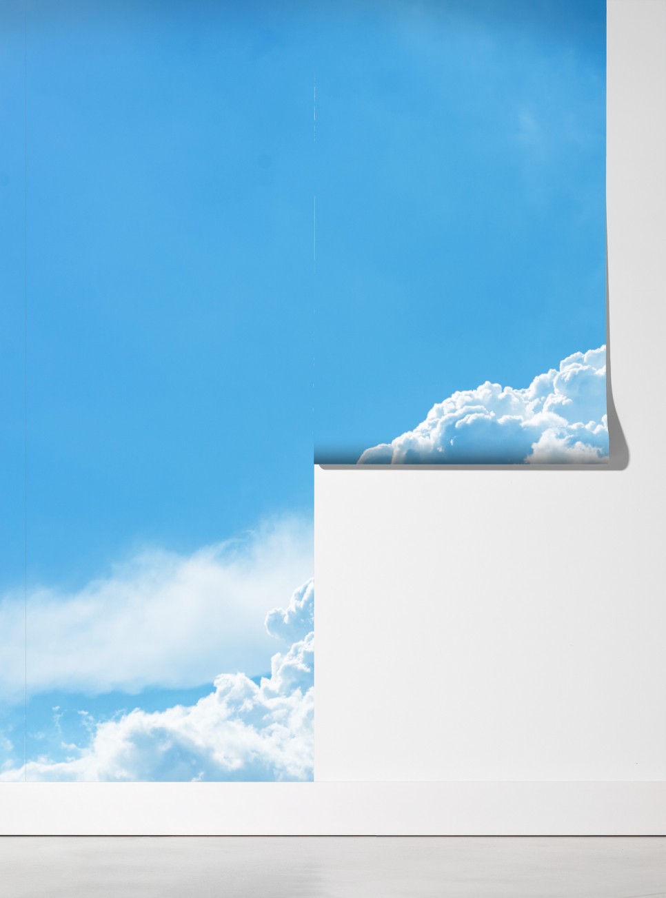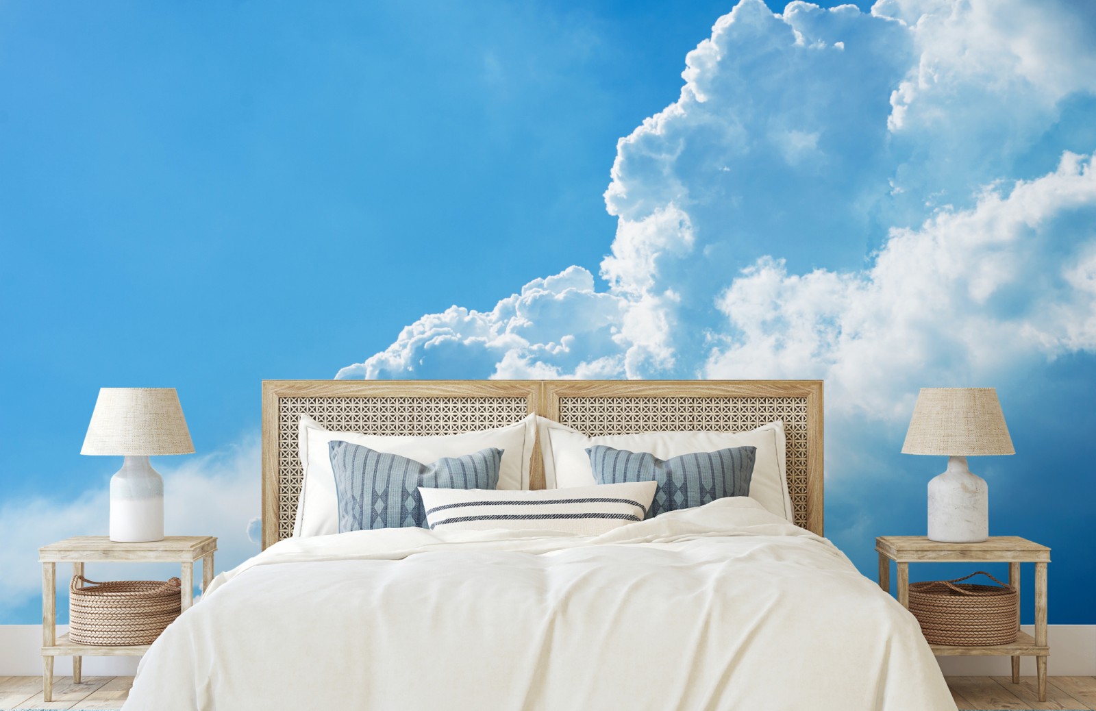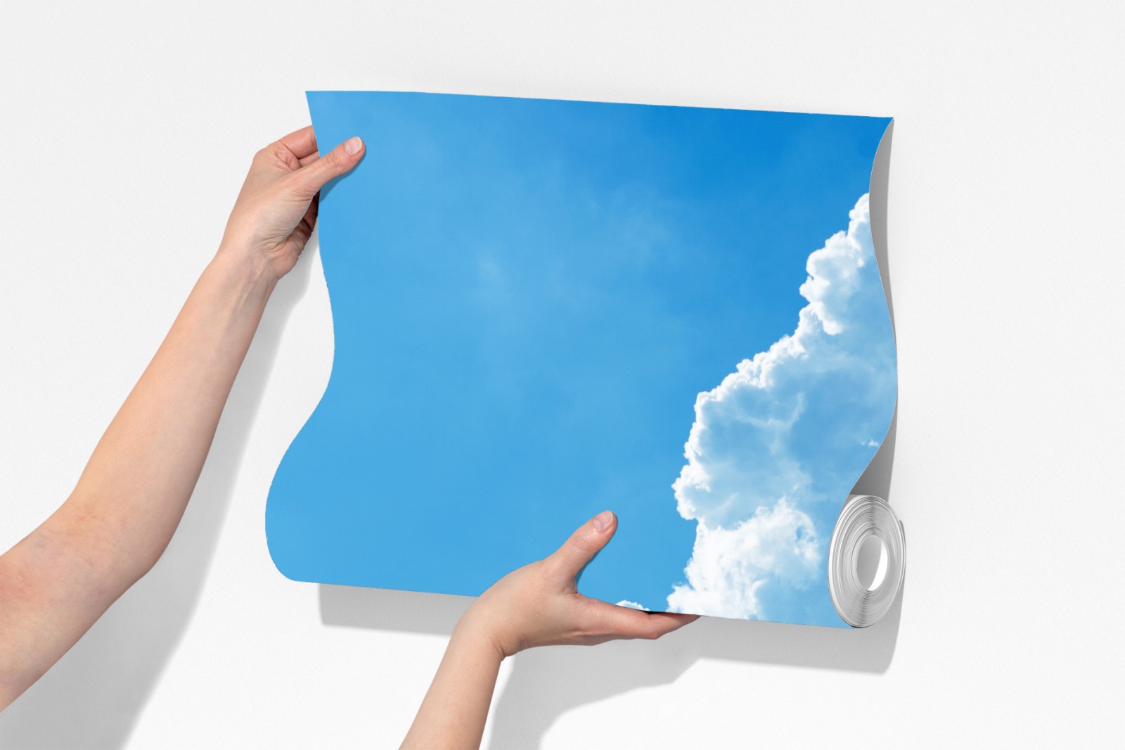 Ein beruhigendes Foto eines hellblauen Himmels mit fluffigen weißen Wolken, das jedem Raum Licht und Ruhe verleiht.