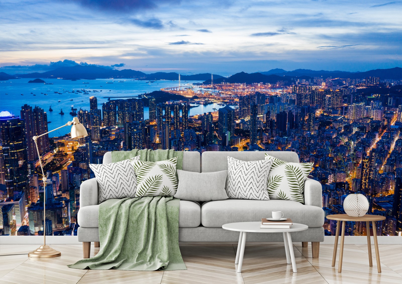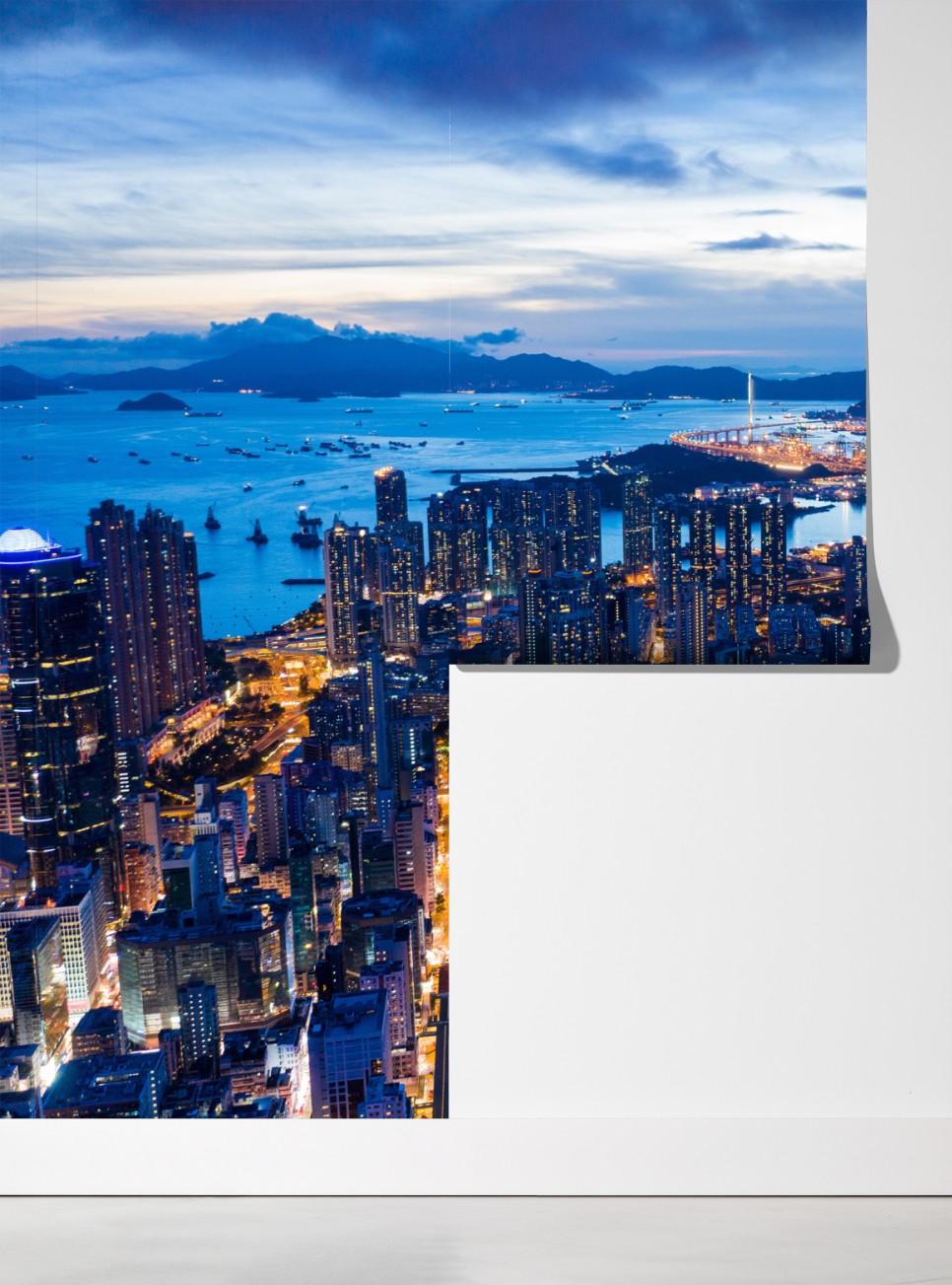 Dramatische Luftaufnahme der beleuchteten Skyline von Hongkong in der Dämmerung, ideal zur Schaffung urbaner Energie und Tiefe in jedem Raum.