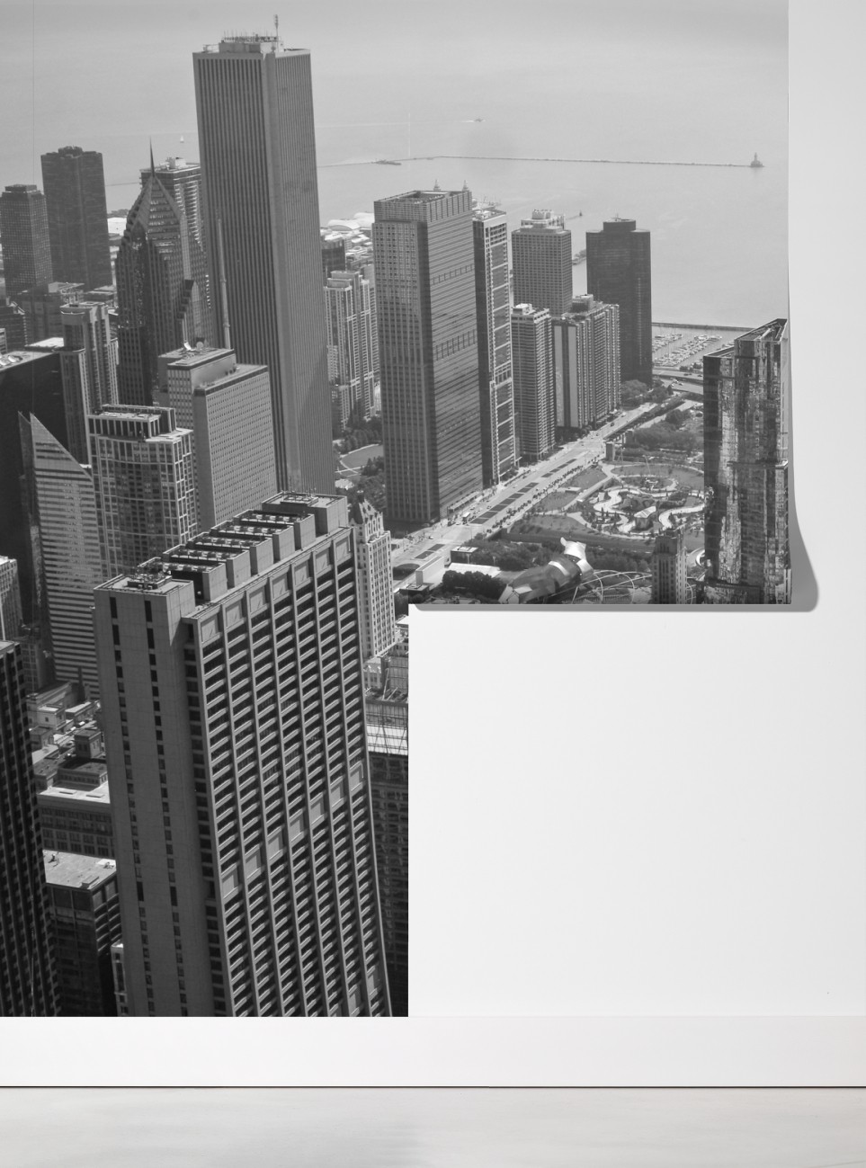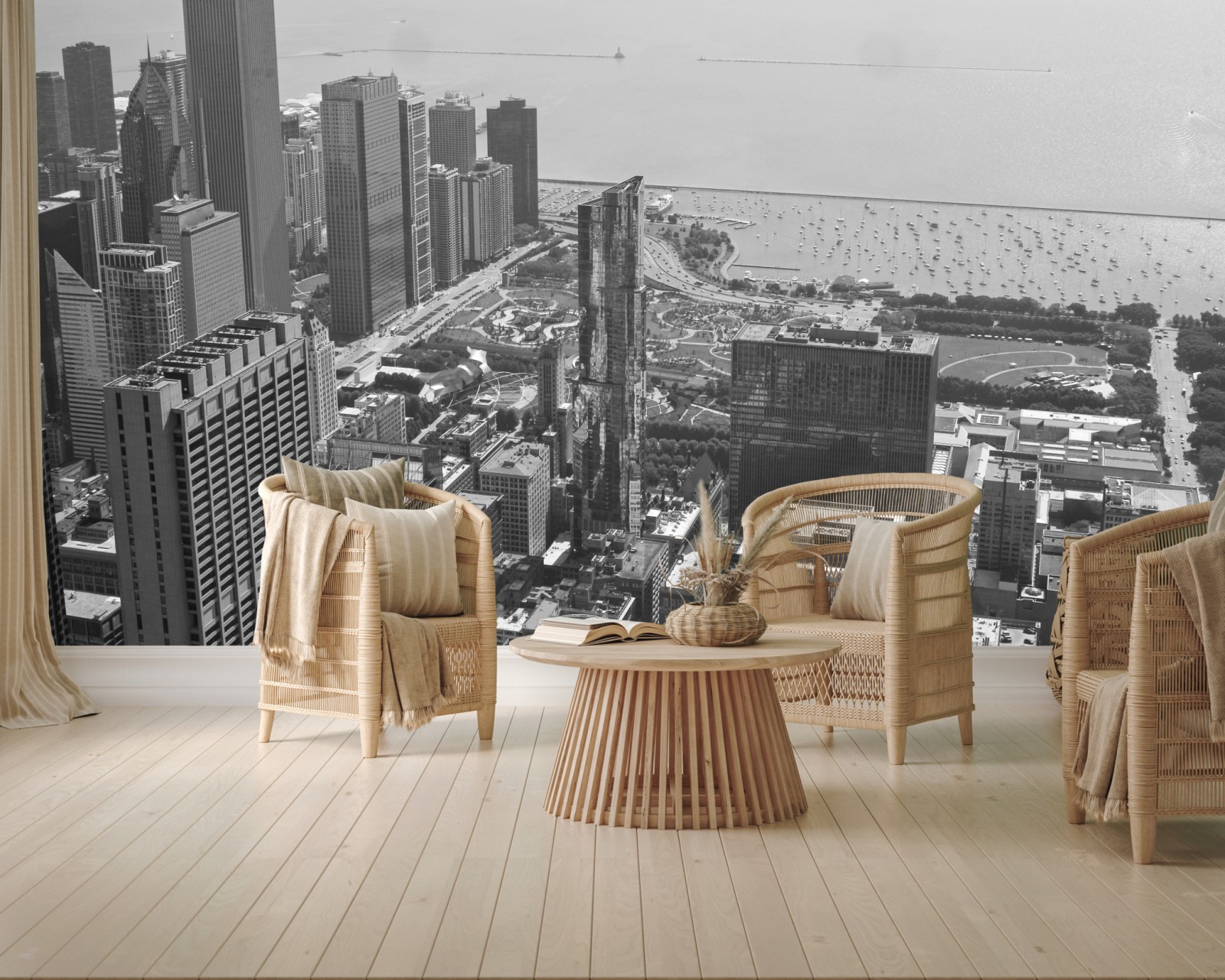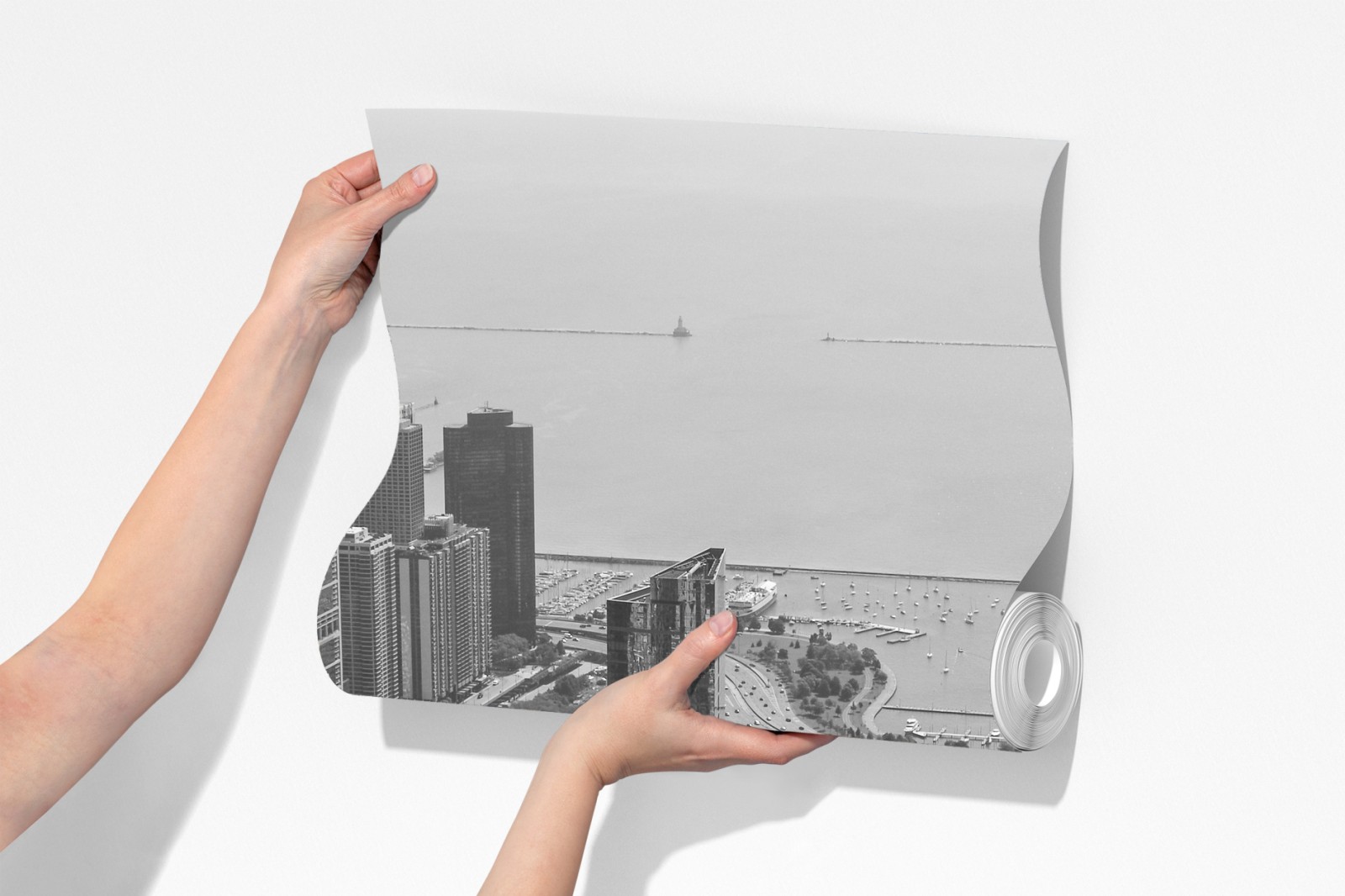 Ein eindrucksvolles monochromes Luftbild einer modernen Stadtsilhouette am Ufer, ideal um jedem Raum urbane Eleganz zu verleihen.