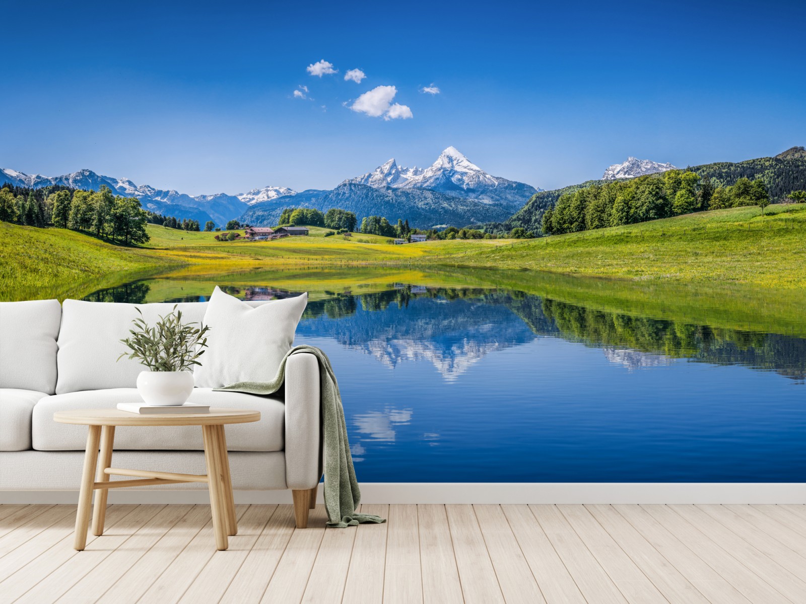 Eine ruhige Alpenlandschaft mit schneebedeckten Gipfeln, die sich in einem klaren See spiegeln und dem Raum natürliche Gelassenheit verleihen.