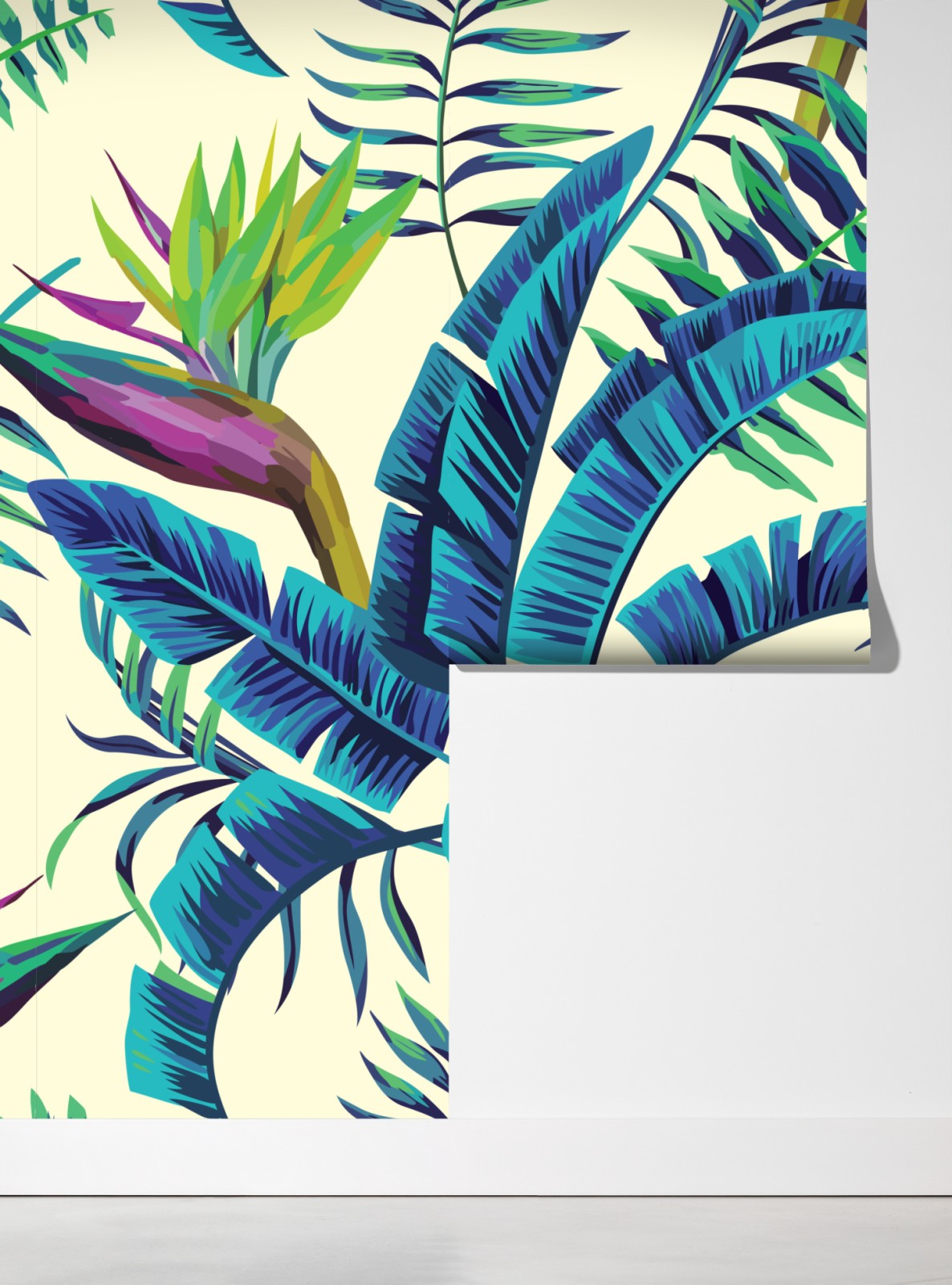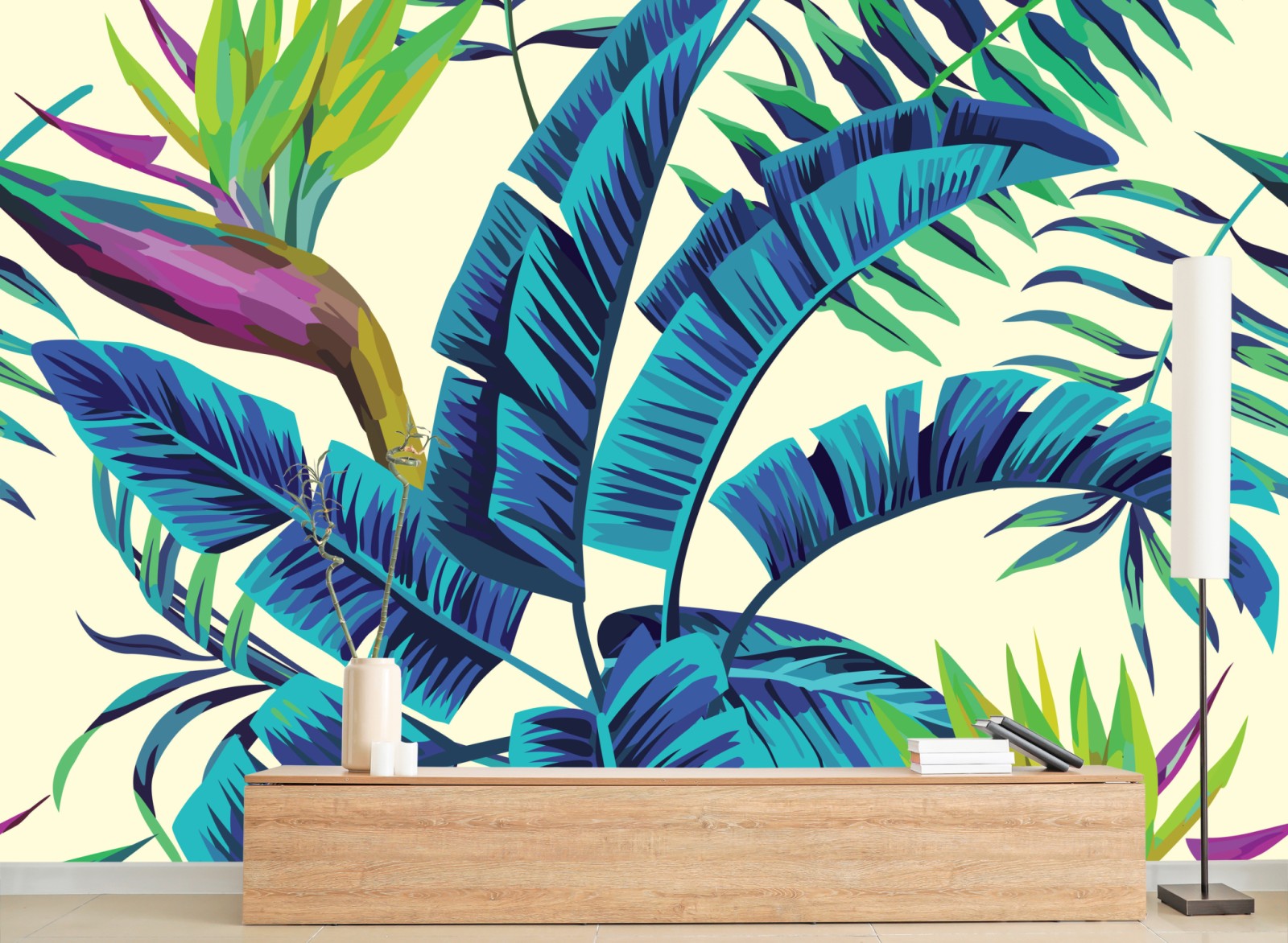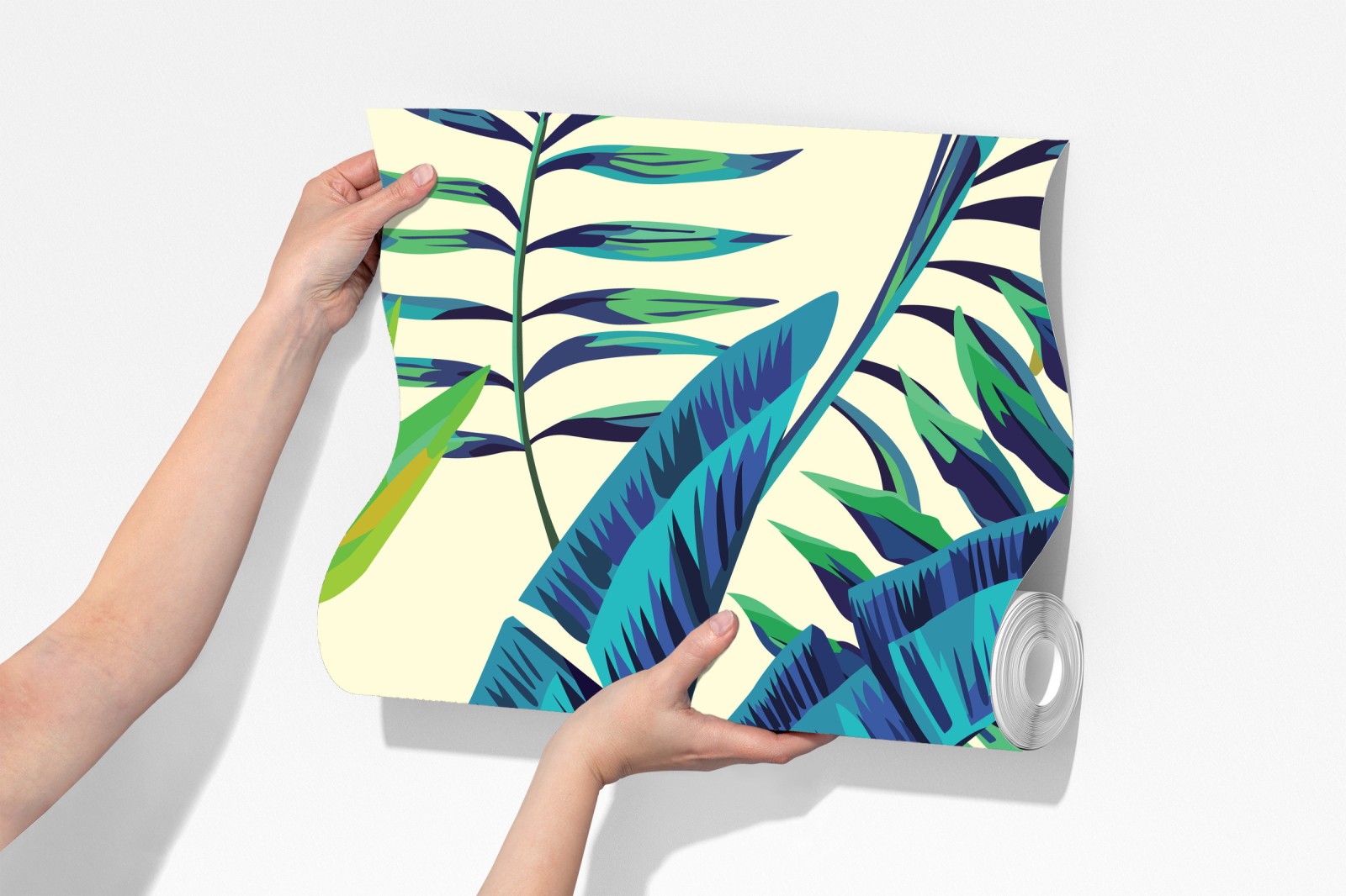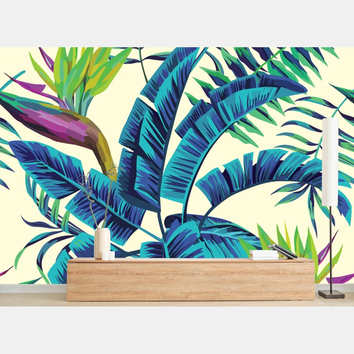Lebendige Illustration tropischer Blätter in türkis- und Grüntönen, die frische botanische Energie in jedes Interieur bringt.