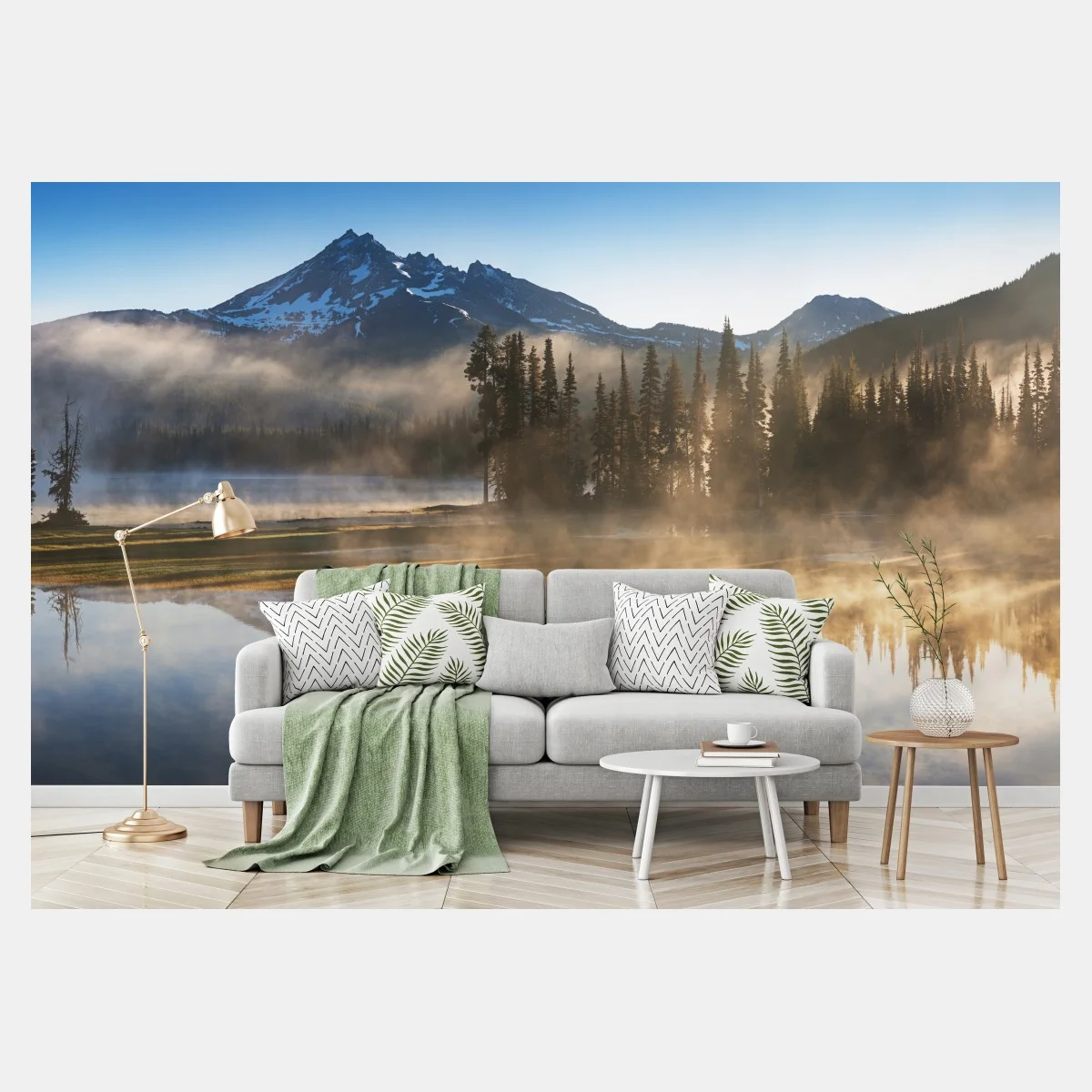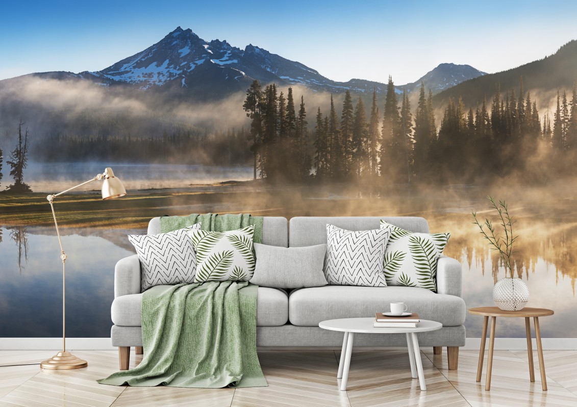 Fototapete Nebliger bergspiegel am see bei sonnenaufgang