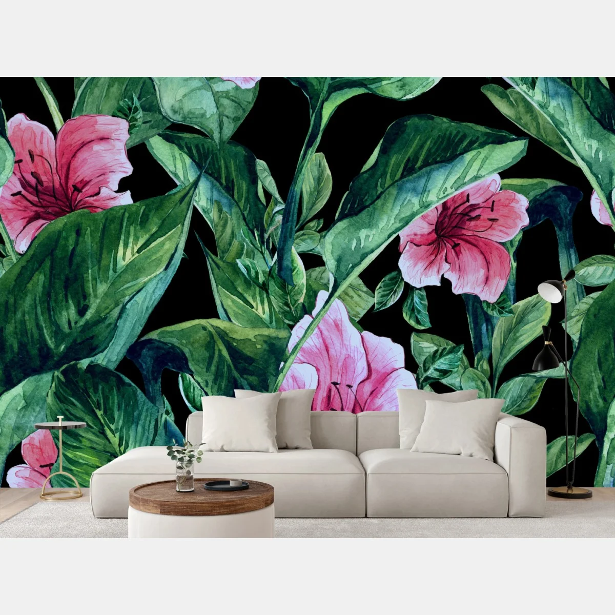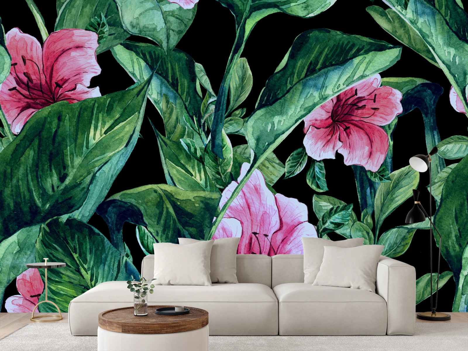 Fototapete Rosa aquarellblumen auf schwarzem hintergrund