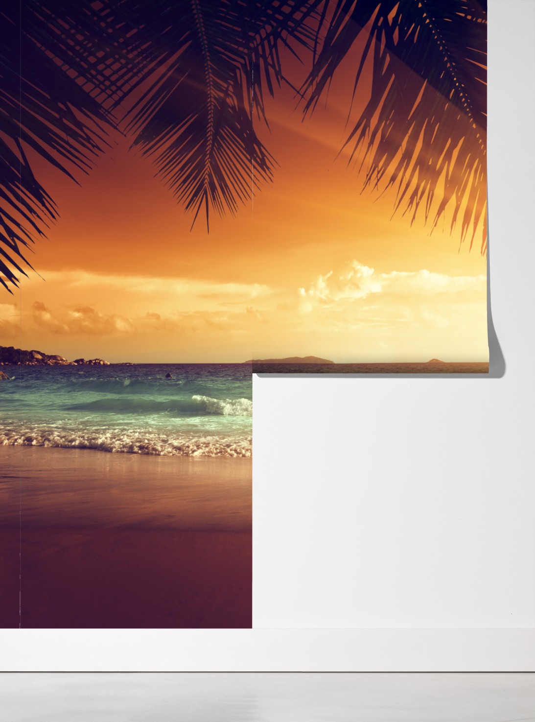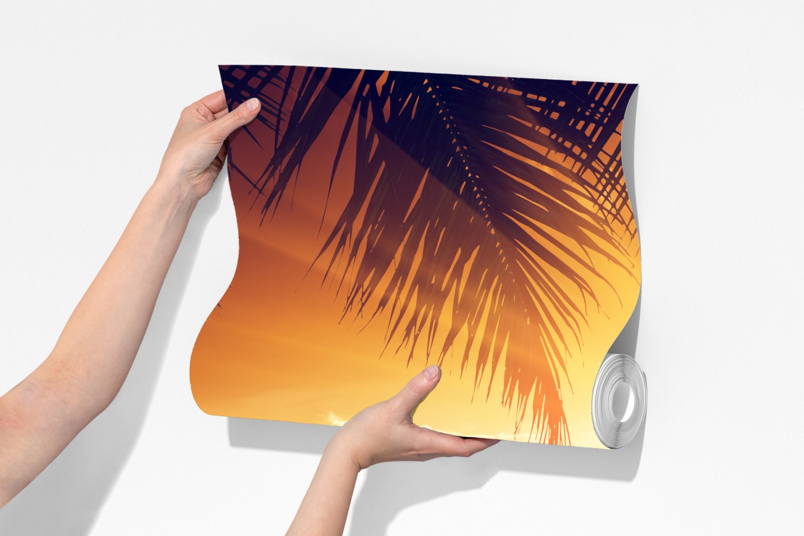 Warmer Sonnenuntergang über einem ruhigen Strand mit Palmen, bringt tropische Ruhe und Atmosphäre in jeden Raum.