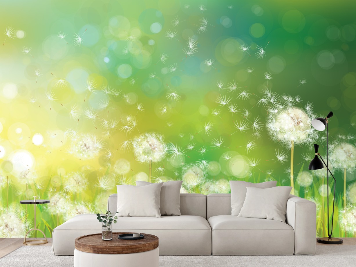 Erhellen Sie Ihren Raum mit einer ruhigen Frühlingswiese aus schwebenden Löwenzahnsamen in zarten Grün- und Gelbtönen, die eine beruhigende, luftige Atmosphäre für moderne Innenräume schafft.MehrWeniger